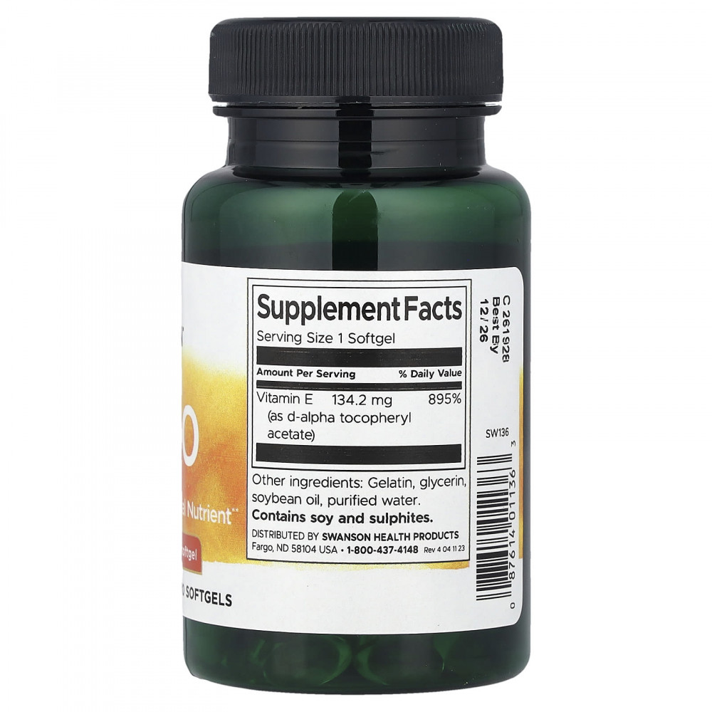 В последние годы витамин E привлекает к себе много внимания благодаря ценной питательной поддержке, которую он обеспечивает для здоровья сердца и сердечно-сосудистой системы, однако его действие не ограничивается только пользой для сердца. Антиоксидантные свойства витамина E помогают защитить жизненно важные ткани организма от свободных радикалов. Натуральный витамин E от Swanson содержит 134,2 мг в 1 порции (1 капсула).