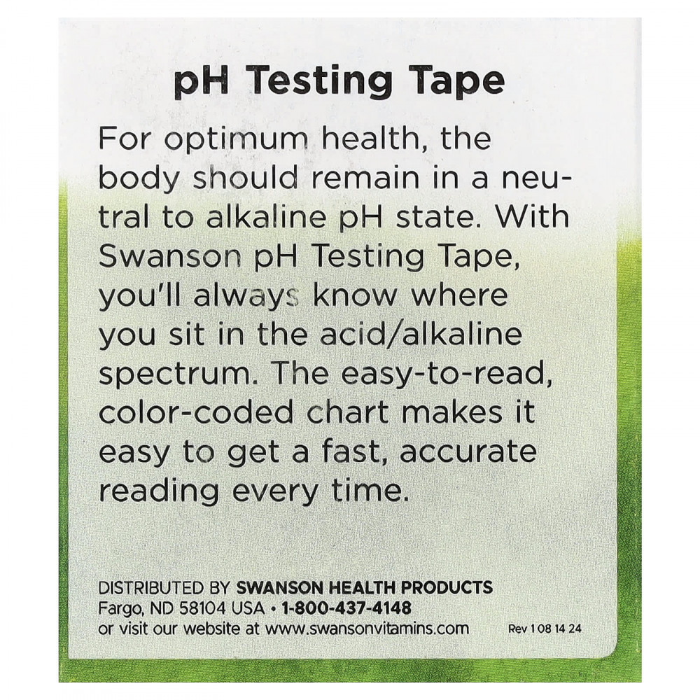 Для оптимального здоровья в организме должен поддерживаться уровень pH от нейтрального до щелочного. С лентой для проверки pH Swanson вы всегда будете знать свое место в кислотном / щелочном спектре. Удобная для чтения диаграмма с цветовой кодировкой позволяет быстро и точно получать результаты каждый раз.