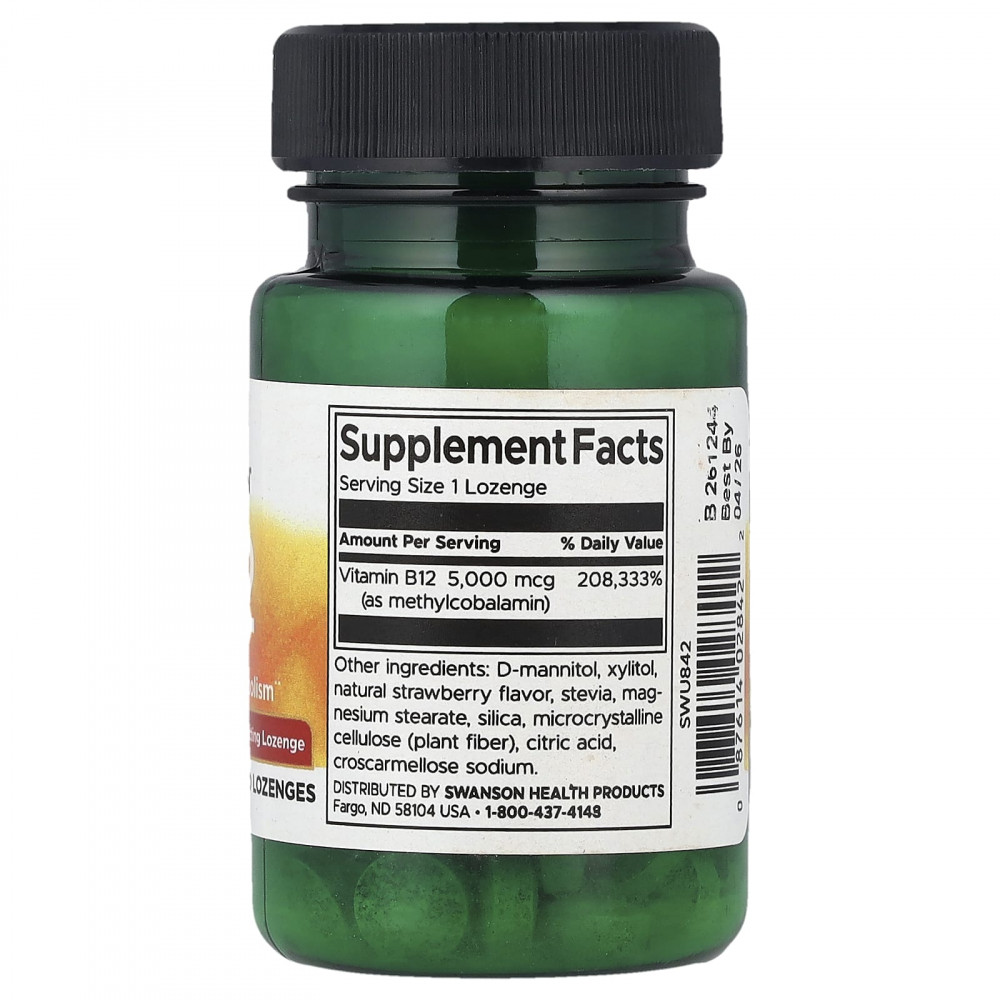 Метилкобаламин, поставляемый в виде подбородочных растворимых таблеток для полости рта, дает двойное преимущество для надежного приема пищевой добавки. Витамин B12 от Swanson — это самая быстродействующая форма в виде быстрорастворимой и усваиваемой таблетки. Продукт не требует переработки, ненужных красителей или сахара, а также жидких пипеток, которые загрязняют организм.