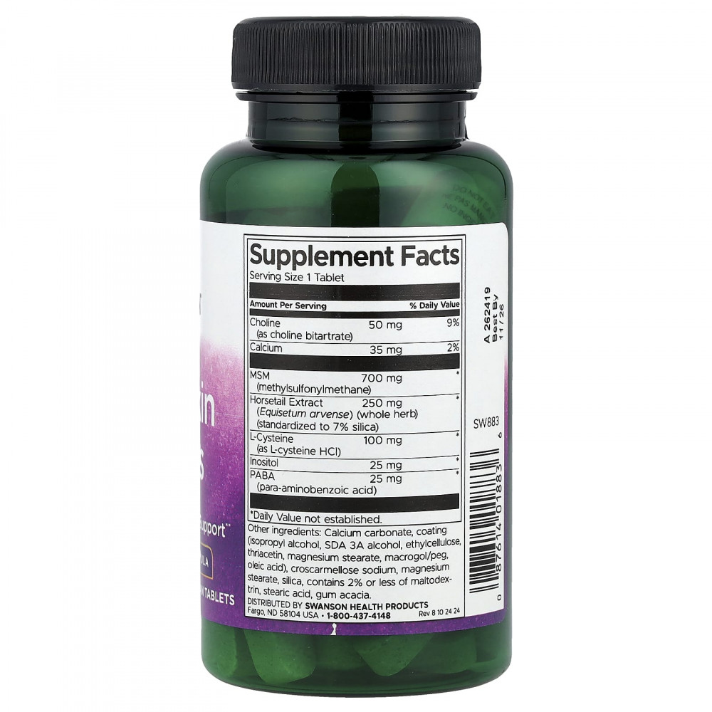 Красота — это не только красивая кожа. Шелковистые, густые волосы, красивый цвет лица, изящные ногти — эти признаки красоты не проявляются сами по себе. Чтобы хорошо выглядеть, необходимо хорошее питание. В этом суть добавки Swanson для волос, кожи и ногтей. Она сочетает в себе органическую серу МСМ и диоксид кремния из экстракта хвоща с ключевыми витаминами группы B, чтобы обеспечить оптимальное питание для поддержания красоты.