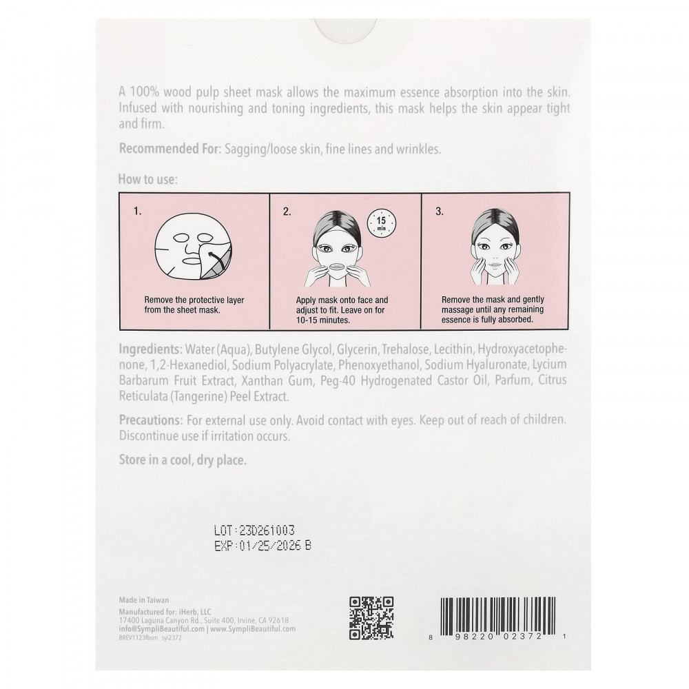 Подтягивающие тканевые маски от Sympli® Beautiful помогают уменьшить мелкие и глубокие морщины и дряблость кожи. Биоразлагаемые маски из 100% древесной целлюлозы обеспечивают максимальное поглощение гиалуроновой кислоты, лецитина и фруктовых экстрактов, питают и тонизируют кожу, помогают ей выглядеть упругой и подтянутой.