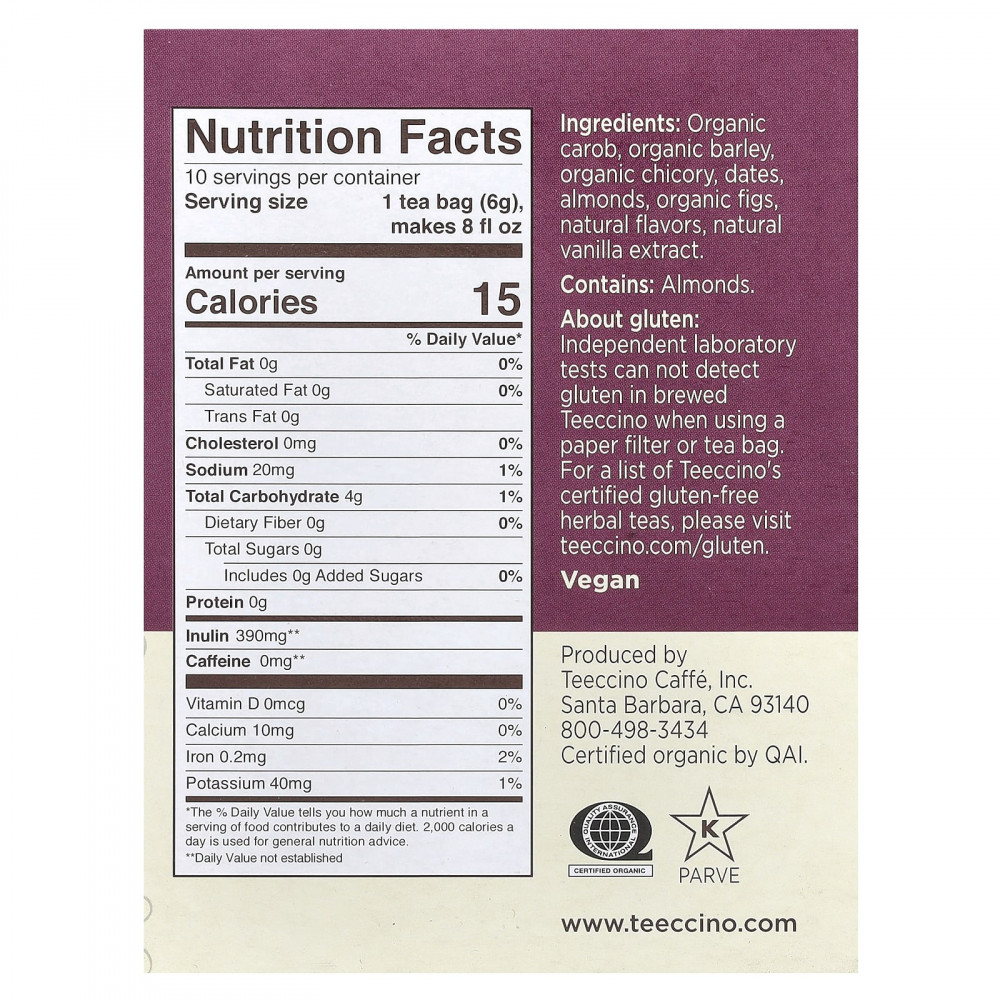 Независимо от того, любите ли вы чай или кофе, вам понравится насыщенный и насыщенный вкус Teeccino, который поклонники описывают как более мягкий, насыщенный и сливочный, чем у кофе. В чем секрет? Во французском цикории, обжаренном корне, который часто добавляют в кофе, смешанном с ячменем, любимым итальянским сортом без кофеина, и испанским рожковым деревом, известным своим шоколадным привкусом. Обогащенный калифорнийскими миндалем, финиками и инжиром, Teeccino готовит чашку восхитительного чая... или кофе? Предоставляем выбор вам!