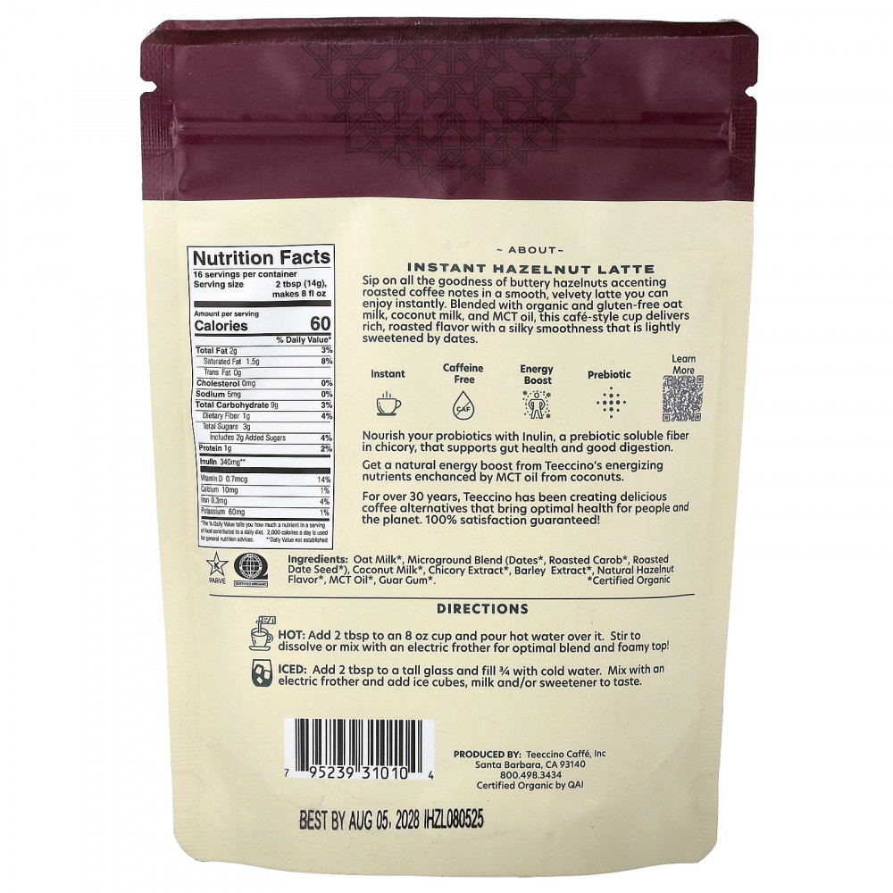 Ощутите всю пользу маслянистого фундука с нотками обжаренного кофе в мягком и бархатном латте, которым вы сможете насладиться мгновенно. Эта чашка кофе в стиле кофе, содержащая органическое овсяное молоко без глютена, кокосовое молоко и масло MCT, обеспечивает насыщенный обжаренный вкус с шелковистой мягкостью и слегка подслащена финиками.
