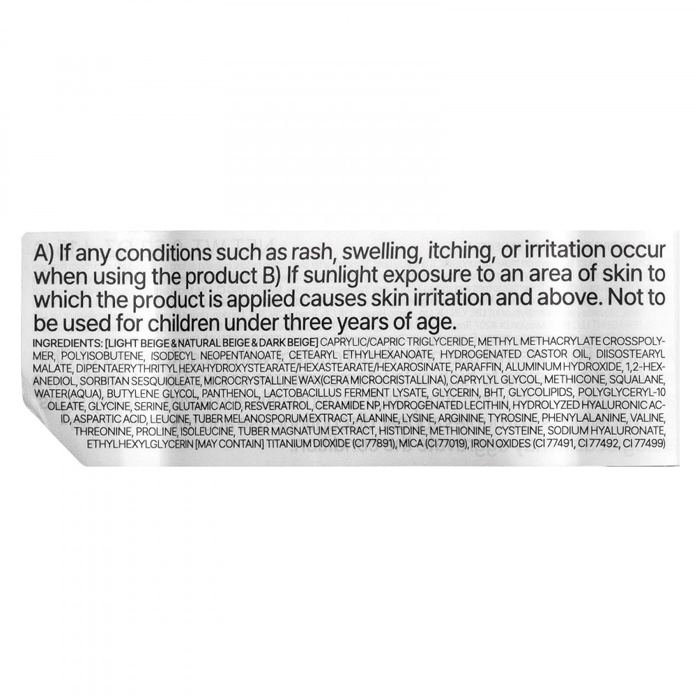 Каприловый/каприновый триглицерид, метил метакрилат кроссполимер, полиизобутен, изодецилнеопентаноат, цетеариловый этилгексаноат, гидрогенизированное касторовое масло, диизостеарил малат, дипентаэритритил гексагидроксистеорат/гексастерат/гексаросинат, парафина, гидроксид алюминия, 1,2-гександиол, сорбитана сесквиолеат, микрокристаллический воск(Cera микрокристаллический), каприлилгликоль, метикон, сквалан, вода (Aqua), бутиленгликоль, пантенол, лизат продукта ферментации лактобактерий, глицерин, бутилгидрокситолуол, гликолипиды, полиглицерил-10 олеат, глицин, серин, глутаминовая кислота, ресвератрол, керамид NP, гидрогенизированный лецитин, гидролизованная гиалуроновая кислота, аспарагиновая кислота, лейцин, экстракт клубня меланоспорума (Tuber melanosporum), аланин, лизин, аргинин, тирозин, фенилаланин, валин, треонин, пролин, изолейцин, экстракт белого трюфеля (Tuber magnatum), гистидин, метионин, цистеин, гиалуронат натрия, этилгексилглицерин [может содержать] диоксид титана (CI 77891), слюда (CI 77019), оксиды железа (CI 77491, CI 77492, CI 77499).