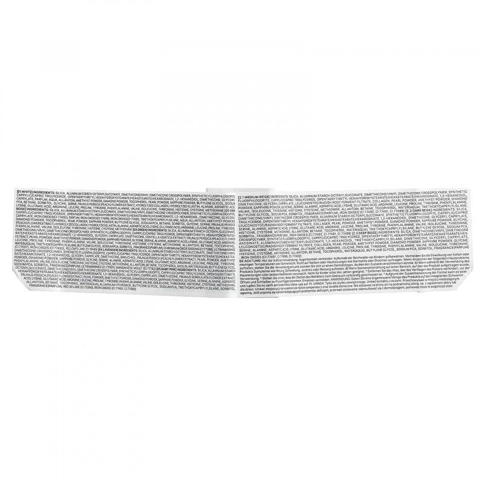 Диоксид кремния, алюминия крахмал октенилсукцинат, диметикон/винил диметикон кроссполимер, синтетический фторфлогопит, каприловый/каприновый триглицерид, дипентаэритритил гексагидроксистеорат/гексастерат/гексаросинат, 1,2-гександиол, диметикон, глицерил каприлат, отдушка, вода, аллантоин, аметистовый порошок, алмазный порошок, токоферол, жемчужный порошок, сапфировый порошок, бутиленгликоль, натрия пирролидонкарбонат, бетаин, сорбитол, глицин, серин, экстракт цветков персика (Prunus persica), гидролизованный коллаген, гидролизованный эластин, аланин, аспарагиновая кислота, лизин, глутаминовая кислота, аргинин, лейцин, пролин, тирозин, фенилаланин, валин, изолейцин, треонин, гистидин, цистеин, метионин.
