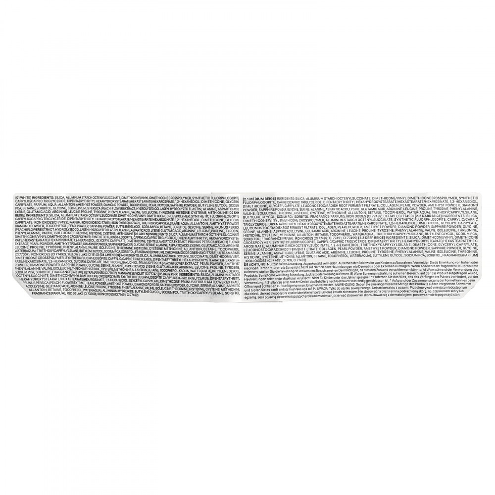 Диоксид кремния, алюминия крахмал октенилсукцинат, диметикон/винил диметикон кроссполимер, синтетический фторфлогопит, каприловый/каприновый триглицерид, дипентаэритритил гексагидроксистеорат/гексастерат/гексаросинат, 1,2-гександиол, глицерил каприлат, диметикон, экстракт цветков вишни мелкопильчатой (Prunus serrulata), экстракт цветков персика (Prunus persica), жемчужный порошок, аметистовый порошок, алмазный порошок, сапфировый порошок, глицин, серин, аланин, аспарагиновая кислота, лизин, глутаминовая кислота, аргинин, лейцин, пролин, тирозин, фенилаланин, валин, изолейцин, треонин, гистидин, цистеин, метионина, аллантоин, бетаин, токоферол, вода, гидроксид алюминия, бутиленгликоль, натрия пирролидонкарбонат, триэтоксикаприлилсилан, сорбитол, отдушка, краситель красный 30 лак (CI 73360), оксиды железа (CI 77491, CI 77492).