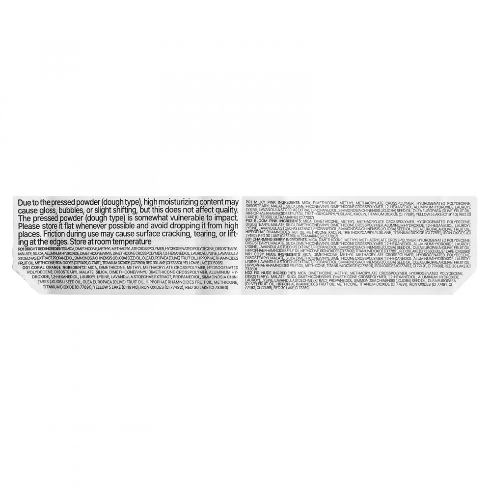 Из-за прессованного порошка (тестообразного типа) высокое содержание увлажняющих компонентов может привести к блеску, образованию пузырей или легкому обесцвечиванию, но это не влияет на качество. Прессованный порошок (типа пасты) чувствителен к ударам. По возможности храните планшет в ровной форме. Не роняйте его с высоких мест. Трение во время использования может привести к растрескиванию поверхности, разрывам или приподниманию краев. Хранить при комнатной температуре.