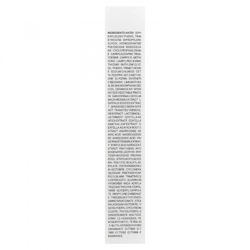 Вода, дифенил силокси фенилтриметикон, дипропиленгликоль, гидрогенизированный полидецен изододекан, циклопентасилоксан, каприловый/каприновый триглицерид, каприлил метикон, лаурил ПЭГ-8 диметикон, бутиленгликоль, фенилтриметикон, хлорид натрия, цетил ПЭГ/ППГ-10/1 диметикон глицерин, синтетический воск, масло из семян пенника лугового (Limnanthes alba), керамид NP, гидролизированный растительный протеин, экстракт трутовика лакированного (Ganoderma lucidum), экстракт шиитаке (Lentinus edodes), экстракт спарассиса курчавого (Sparassis crispa), экстракт трутовика разноцветного (Trametes versicolor), фермент лактобактерий (Lactobacillus), экстракт готу колы (Centella asiatica), экстракт листьев готу колы (Centella asiatica), экстракт готу колы (Centella asiatica), азиатикозид, азиатиковая кислота, мадекассосид, мадекассовая кислота, экстракт коры сосны приморской (Pinus pinaster), экстракт портулака огородного (Portulaca oleracea), пантенол гидрогенизированный лецитин, фитосфингозин, пропандиол, этилгексилглицерин, поли c10-30 алкил акрилат, дистеардимония гекторит. циклогексасилоксан, триэтоксикаприлилсилан, триметилсилоксисиликат алюминия, гидроксид слюды, акрилат/диметикон сополимер глицерил каприлат, пропиленкарбонат, тринатрий этилендиамин дисукцинат стеаралкония гекторит, полиглицерил-3 полирицинолеат, полиглицерил-3 диизостеарат, мальтодекстрин, 1,2-гександиол, пентаэритритил тетра-ди-трет-бутил гидроксигидроциннамат, отдушка. Может содержать диоксид титана (CI77891), оксиды железа (CI77491, CI77492, CI 77499).