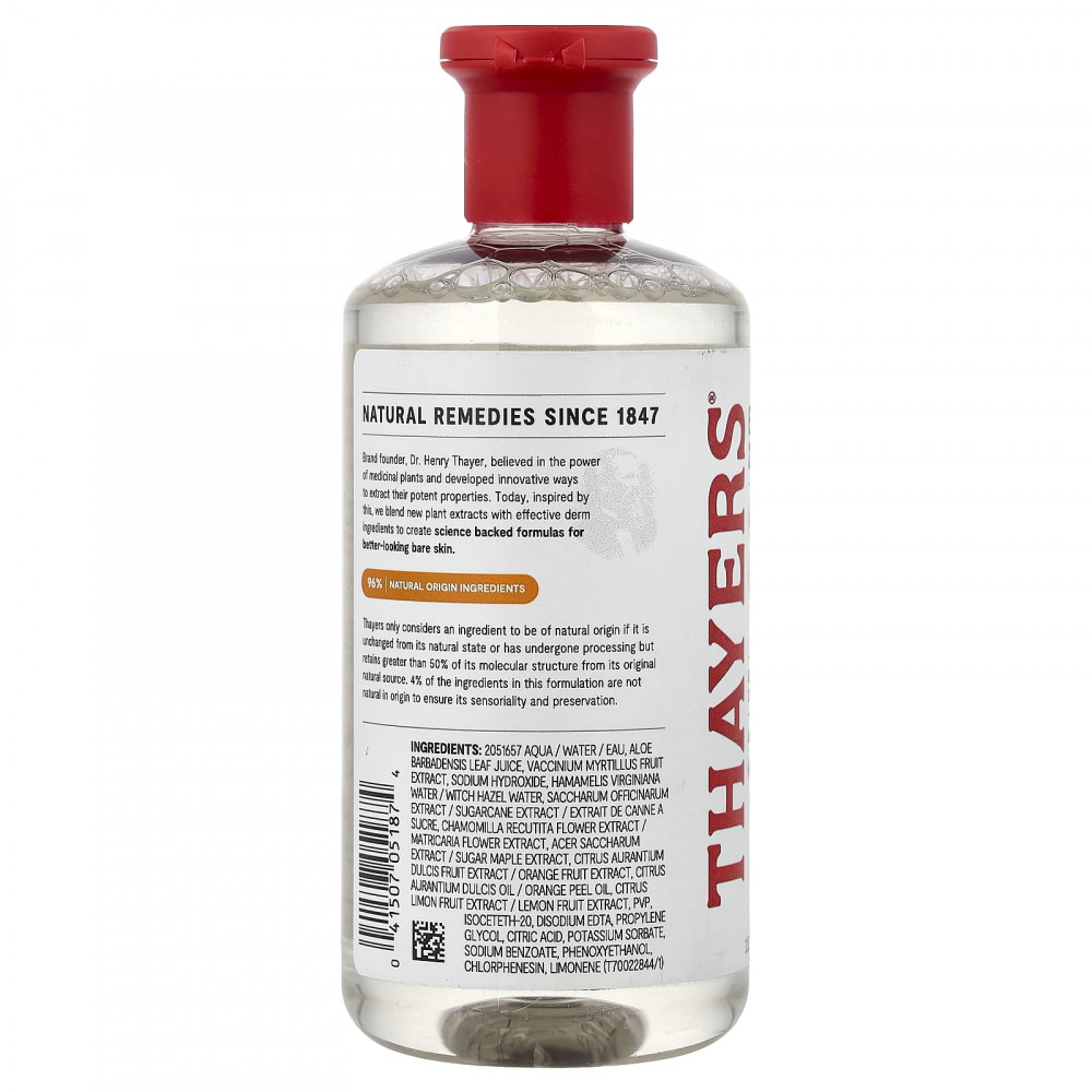 Компания Thayers считает ингредиент натуральным происхождением только в том случае, если он не изменился по сравнению с естественным состоянием или был обработан, но при этом сохраняет более 50% своей молекулярной структуры из своего первоначального природного источника. 4% ингредиентов в этой формуле не имеют натурального происхождения, чтобы обеспечить органолептику и сохранность продукта.