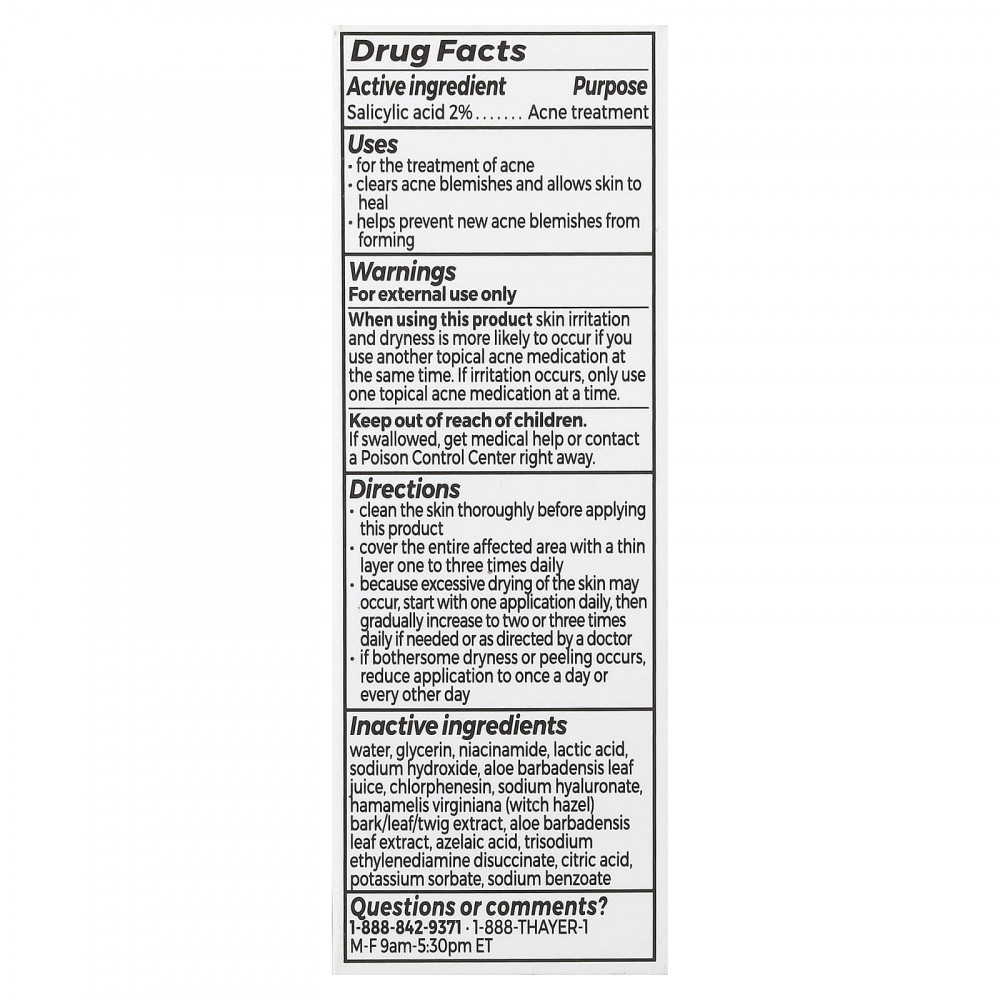 Компания Thayers считает ингредиент натуральным происхождением, только если он не изменился по сравнению с естественным состоянием или был обработан, но сохраняет более 50% своей молекулярной структуры из своего первоначального природного источника. 11% ингредиентов в сыворотке против акне двойного действия Thayers, включая активный ингредиент салициловую кислоту, не имеют натурального происхождения, чтобы обеспечить ее эффективность, органолептику и сохранность.