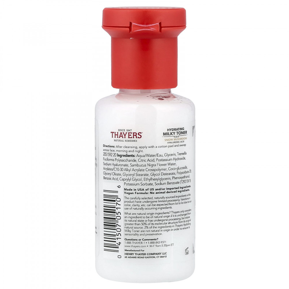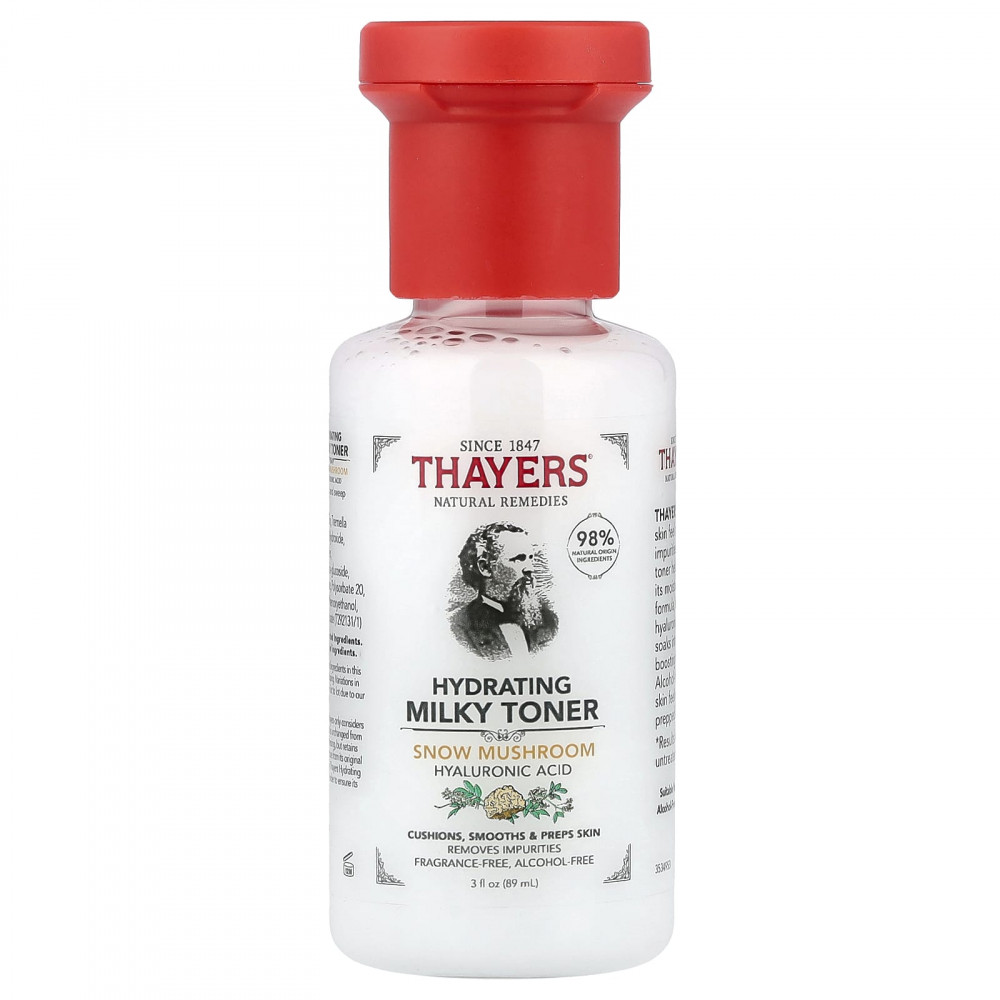 Увлажняющий молочный тонер от Thayers смягчает кожу и удаляет загрязнения. Этот нежный тоник молочного цвета со сбалансированным уровнем pH помогает повысить тонус кожи, не нарушая ее влагоудерживающий барьер. Нежная кремообразная формула, содержащая снежный гриб, гиалуроновую кислоту и воду из цветков бузины, впитывается в кожу, увлажняя ее в течение всего дня и повышая уровень увлажнения на 35%*. Не содержит спирта и не сушит кожу, делает кожу гладкой, комфортной и готовит ее к следующему этапу ухода.