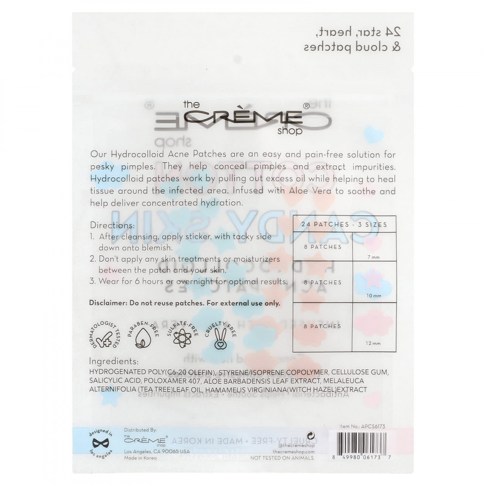 Наши патчи от акне с гидроколлоидом — это легкое и безболезненное решение для избавления от противных прыщей. Они помогают скрыть прыщи и удалить загрязнения. Гидроколлоидные патчи удаляют излишки жира, способствуя заживлению тканей вокруг зараженной области. Обогащен алоэ вера, который успокаивает и обеспечивает концентрированное увлажнение.