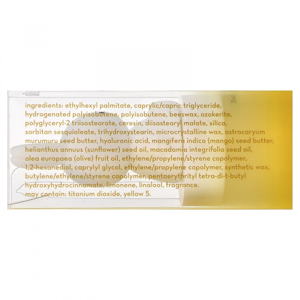 Этилгексил пальмитат, каприловый/каприновый триглицерид, гидрогенизированный полиизобутен, полиизобутен, пчелиный воск, озокерит, полиглицерил-2 триизостеарат, церезин, диизостеарил малат, диоксид кремния, сорбитана сесквиолеат, тригидроксистеарин, микрокристаллический воск, масло семян мурумуру (Astrocaryum murumuru), гиалуроновая кислота, масло из косточек манго (Mangifera indica), подсолнечное масло (Helianthus annuus), масло макадамии (Macadamia integrifolia), оливковое масло (Olea europaea), сополимер этилена/пропилена/стирола, 1,2-гександиол, каприлилгликоль, сополимер этилена/пропилена, синтетический воск, сополимер бутилена/этилена/стирола, пентаэритритил тетра-ди-трет-бутил гидроксигидроциннамат, лимонен, линалоол, отдушка. может содержать диоксид титана, краситель желтый 5.