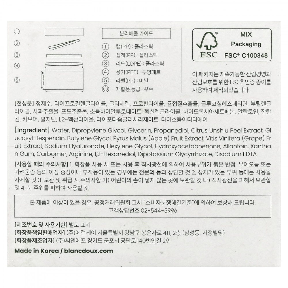 Вода, дипропиленгликоль, глицерин, пропандиол, экстракт цедры мандарина уншиу (Citrus unshiu), глюкозил гесперидин, бутиленгликоль, экстракт яблока (Pyrus malus), экстракт плодов винограда (Vitis vinifera), гиалуронат натрия, гексиленгликоль, гидроксиацетофенон, аллантоин, ксантановая камедь, карбомер, аргинин, 1,2-гександиол, дикалия глицирризат, двунатриевая ЭДТК.
