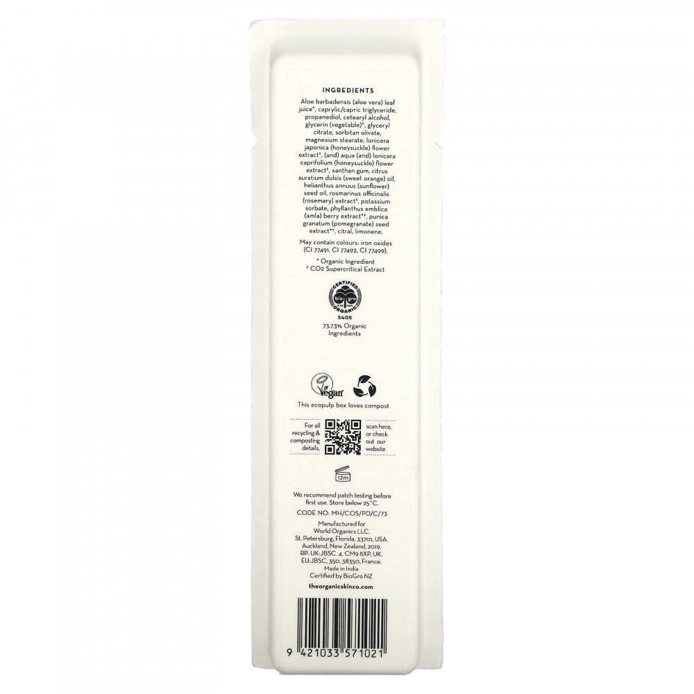 Сок листьев алоэ вера (Aloe barbadensis)*, каприловый/каприновый триглицерид, пропандиол, цетеариловый спирт, глицерин (растительный) *, глицерил цитрат, сорбитан оливат, стеарат магния, экстракт цветков жимолости японской (Lonicera japonica), экстракт цветков жимолости (и) водоросли (Lonicera caprifolium) †, ксантановая камедь, масло сладкого апельсина (Citrus auratium dulsis), подсолнечное масло (Helianthus annuus), экстракт розмарина (Rosmarinus officinalis) †, сорбат калия, экстракт ягод амлы (Phyllanthus emblica) * †, экстракт косточек граната (Punica granatum) * †, цитраль, лимонен.