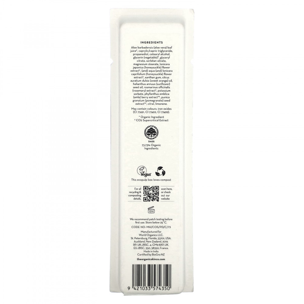 Сок листьев алоэ вера (Aloe barbadensis) *, каприловый / каприновый триглицерид, пропандиол, цетеариловый спирт, глицерин (растительный) *, глицерил цитрат, сорбитан оливат, стеарат магния, экстракт цветков жимолости (Lonicera japonica) †, экстракт цветков жимолости (Lonicera caprifolium), ксантановая камедь, масло сладкого апельсина (Citrus auratium dulsis), подсолнечное масло (Helianthus annuus), экстракт розмарина (Rosmarinus officinalis) †, сорбат калия, экстракт ягод амлы (Phyllanthus emblica) * †, экстракт косточек граната (Punica granatum) * †, цитраль, лимонен.
