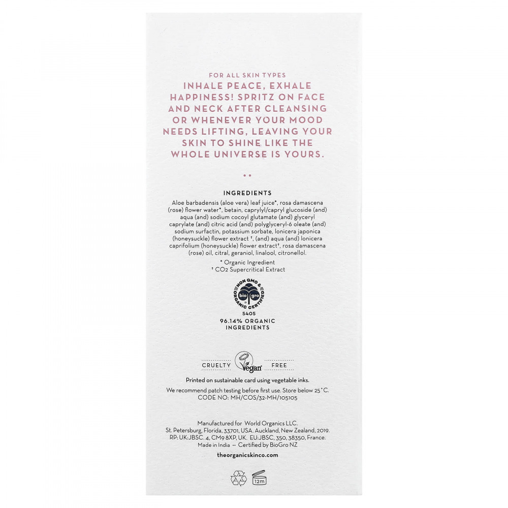 Сок листьев алоэ вера (Aloe barbadensis)*, вода из цветков розы (Rosa damascena) *, бетаин, каприлил / каприл глюкозид (и) аква (и) кокоил глутамат натрия (и) глицерил каприлат (и) лимонная кислота (и) полиглицерил-6 олеат (и) сурфактин натрия, сорбат калия, экстракт цветков жимолости (Lonicera japonica) †, экстракт цветков жимолости (и) водоросли (Lonicera caprifolium) †, масло дамасской розы, цитраль, гераниол, линалоол, цитронеллола.
