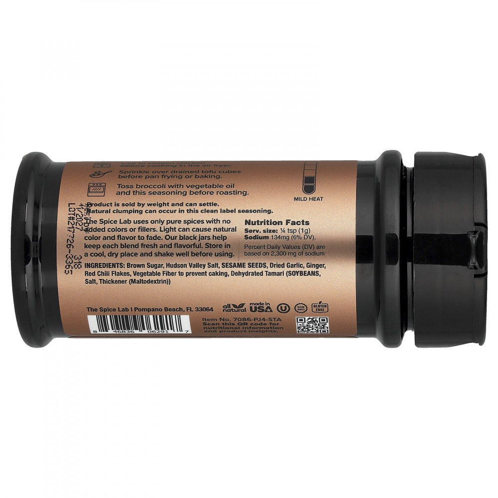 Коричневый сахар, соль Hudson Valley, кунжута, сушёный чеснок, имбиря, красный чили в хлопьях, растительная клетчатка для предотвращения слеживания, обезвоженный тамари (соя, соль, загуститель (мальтодекстрин).