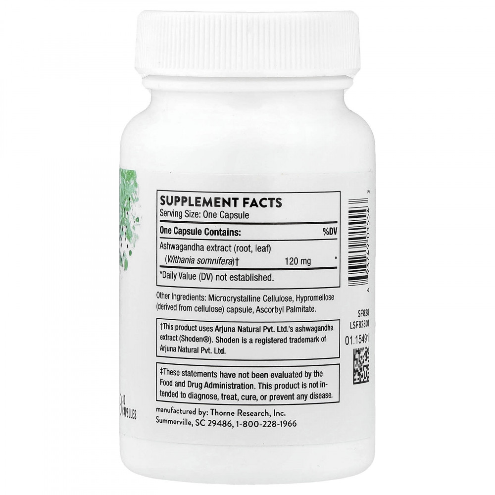Ашваганда от Thorne поддерживает естественную способность организма адаптироваться к повседневному стрессу. Она содержит Shoden, клинически изученный экстракт ашваганды, стандартизированный до 35% гликозидов - ключевых активных соединений, которые способствуют адаптогенному воздействию растения. Этот экстракт полного спектра, полученный из листьев и корня ашваганды (Withania somnifera), обеспечивает разностороннюю поддержку для борьбы со стрессом, энергии и когнитивных функций.