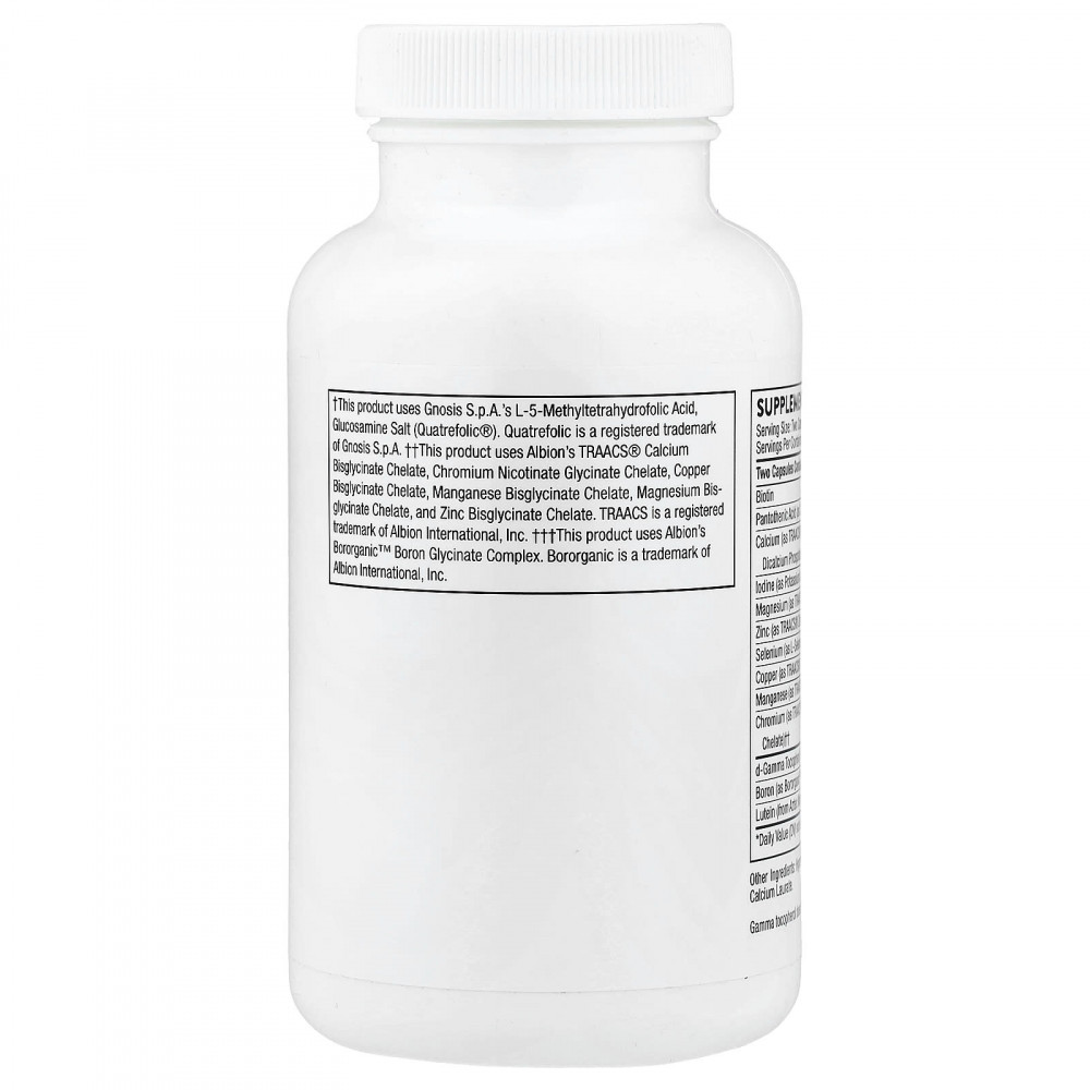 | * Суточная норма не определена. † В этом продукте используется L-5-метилтетрагидрофолиевая кислота, глюкозаминовая соль (Quatrefolic®) производства Gnosis S.p.A. †† В данном продукте используются ингредиенты системы TRAACS® от компании Albion: хелатный бисглицинат кальция, хелатный никотинат глицинат кальция, хелатный бисглицинат меди, хелатный бисглицинат марганца, хелатный бисглицинат магния и хелатный бисглицинат цинка. ††† В данном продукте используется глицинатный комплекс Bororganic Boron™ компании Albion. Гамма-токоферол не имеет признанного эквивалента в МЕ. | ||
