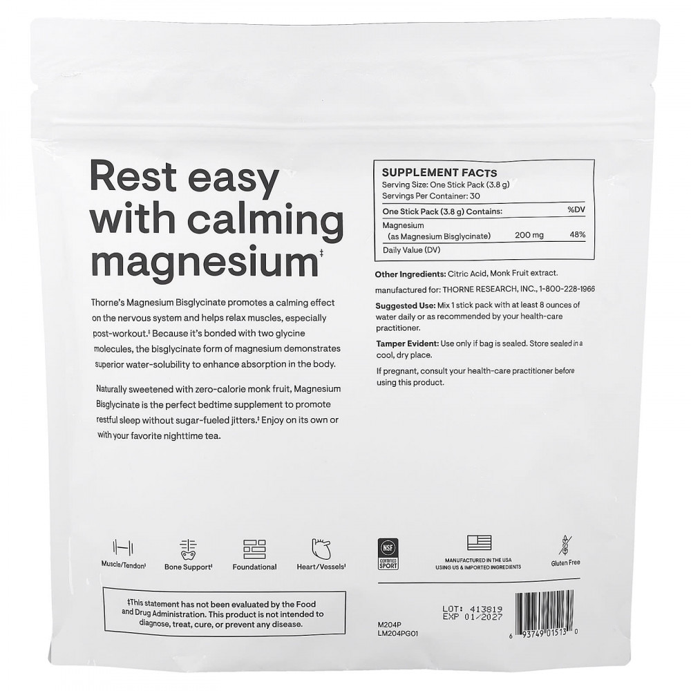 Бисглицинат магния от Thorne оказывает успокаивающее действие на нервную систему и помогает расслабить мышцы, особенно после тренировки. Поскольку бисглицинат магния связан с двумя молекулами глицина, он демонстрирует превосходную растворимость в воде, улучшая усвоение в организме.