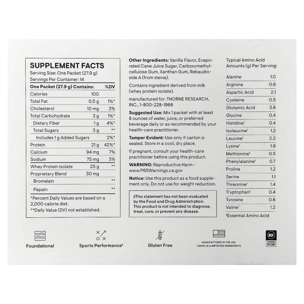 Изолят сывороточного протеина Thorne содержит 21 г биодоступного белка и все 9 незаменимых аминокислот. Изолят сывороточного протеина Thorne, содержащий всего 100 калорий, 3 г сахара и восхитительный ванильный вкус, быстро смешивается с водой и быстро помогает обуздать тягу к еде. Добавьте его в свой любимый фруктовый смузи или добавьте в овсянку на ночь, чтобы получить нежирный и богатый белком завтрак.