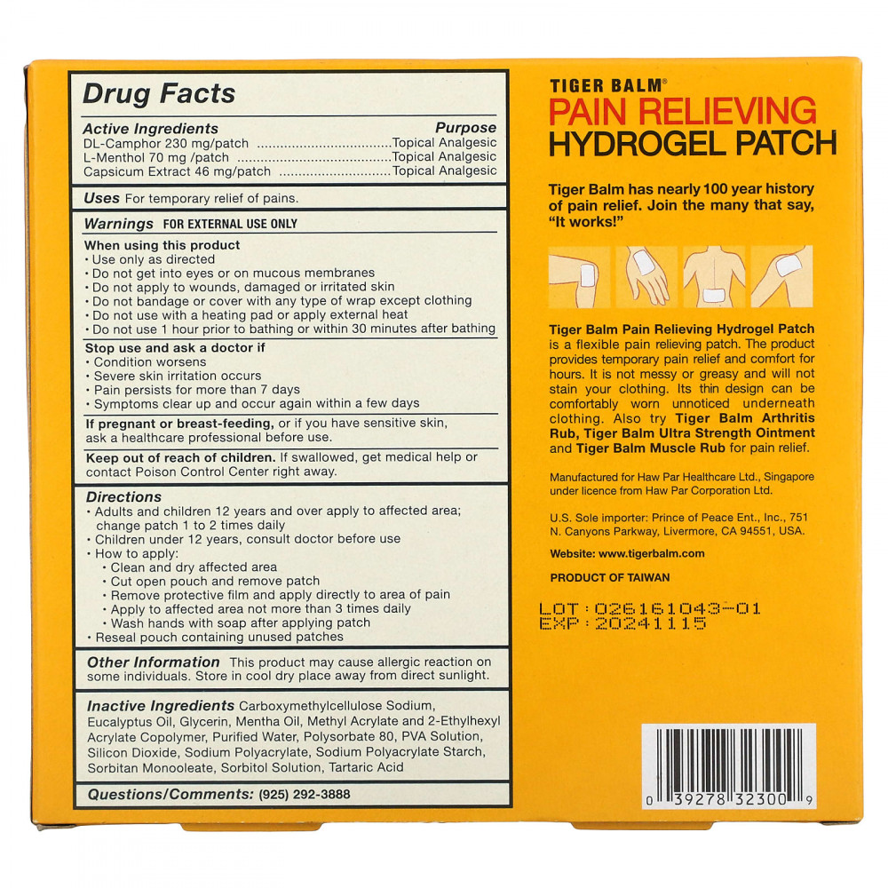 Обезболивающий гидрогелевый патч с тигровым бальзамом — это гибкий обезболивающий пластырь. Продукт обеспечивает временное облегчение боли и комфорт в течение нескольких часов. Он не оставляет грязи или жира и не пачкает одежду. Благодаря тому, что он тонкий, его удобно носить под одеждой. Для снятия боли испробуйте также тигровый бальзам для лечения артрита, сверхсильную мазь с тигровым бальзамом и средство для массажа мышц.