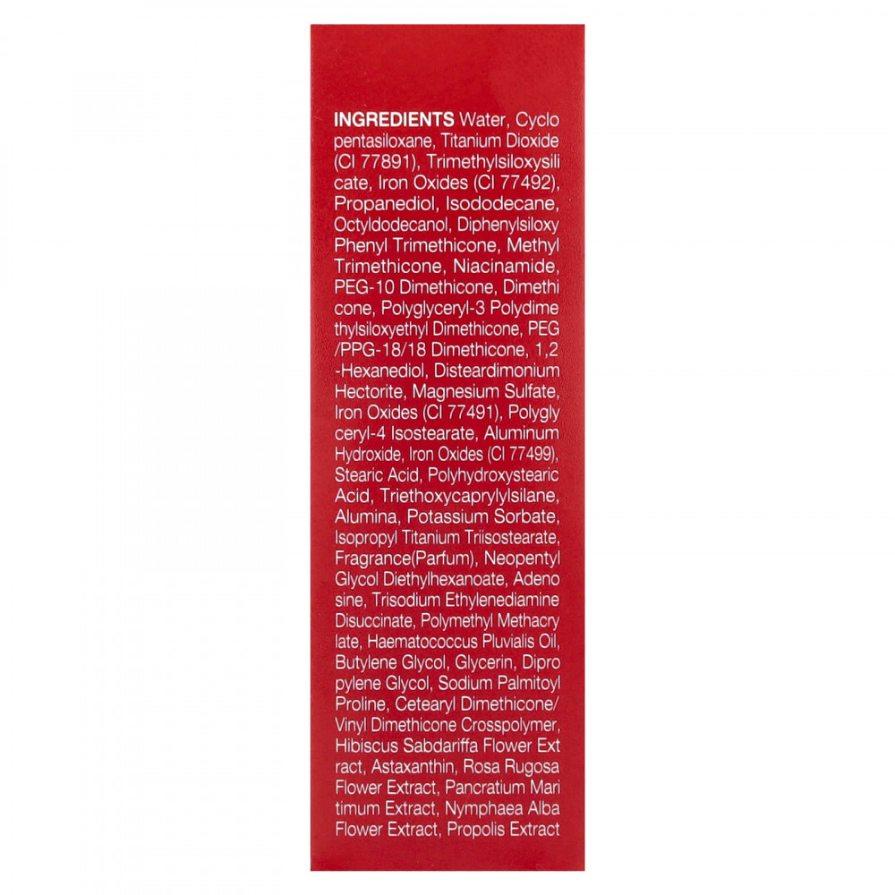 Вода, циклопентасилоксан, диоксид титана (CI 77891), триметилсилоксисиликат, оксиды железа (CI 77492), пропандиол, изододекан, октилдодеканол, дифенил силокси фенилтриметикон, метилтриметикон, никотинамид, ПЭГ-10 диметикон, диметикон, полиглицерил-3-полидиметилсилоксиэтилдиметикон, ПЭГ / ППГ-18/18 диметикон, 1,2-гександиол, дистеардимония гекторит, сульфат магния, оксиды железа (CI 77491), полиглицерил-4 изостеарат, гидроксид алюминия, оксиды железа (CI 77499), стеариновая кислота, полигидроксистеариновая кислота, триэтоксикаприлилсилан, оксид алюминия, сорбат калия, изопропиловый триизостеарат титана, отдушка (парфюмерная композиция), неопентилгликоль диэтилгексаноат, аденозин, тринатрия этилендиамин дисукцинат, полиметилметакрилат, гематококк (гематококк плювиальный), бутиленгликоль, глицерин, дипропиленгликоль, пальмитоил пролин натрия, кроссполимер цетеарилдиметикона / винилдиметикона, экстракт цветков розеллы (Hibiscus sabdariffa), астаксантин, экстракт цветков розы морщинистой, экстракт панкрация морского (Pancratium maritimum), экстракт цветков кувшинки белой (Nymphaea alba), экстракт прополиса.