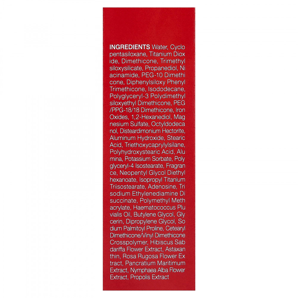 Вода, циклопентасилоксан, диоксид титана, диметикон, триметилсилоксисиликат, пропандиол, никотинамид, ПЭГ-10 диметикон, дифенил силокси фенилтриметикон, изододекан, полиглицерил-3 полидиметилсилоксиэтил диметикон, ПЭГ/ППГ-18/18 диметикон, оксиды железа, 1,2-гександиол, сульфат магния, октилдодеканол, дистеардимония гекторит, гидроксид алюминия, стеариновая кислота, триэтоксикаприлилсилан, полигидроксистеариновая кислота, оксид алюминия, сорбат калия, полиглицерил-4 изостеарат, отдушка, неопентилгликоль диэтил гексаноат, изопропиловый триизостеарат титана, аденозин, тринатрия этилендиамин дисукцинат, полиметилметакрилат, масло гематококка (Haematococcus pluvialis), бутиленгликоль, глицерин, дипропиленгликоль, пальмитоил пролин натрия, цетеарил диметикон/винил диметикон кроссполимер, экстракт цветков розеллы (Hibiscus sabdariffa), астаксантин, экстракт цветков розы морщинистой, экстракт панкрация морского (Pancratium maritimum), экстракт цветков кувшинки белой (Nymphaea alba), экстракт прополиса.