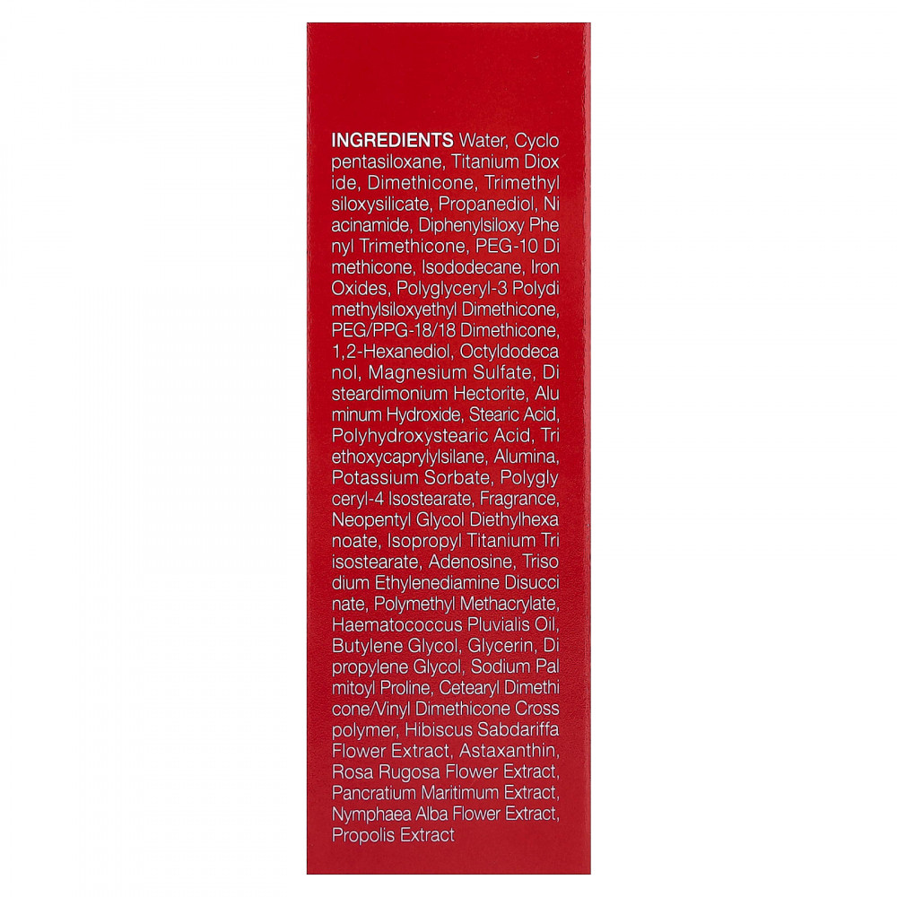 Вода, циклопентасилоксан, диоксид титана, диметикон, триметилсилоксисиликат, пропандиол, никотинамид, дифенил силокси фенилтриметикон, ПЭГ-10 диметикон, изододекан, оксиды железа, полиглицерил-3 полидиметилсилоксиэтил диметикон, ПЭГ/ППГ-18/18 диметикон, 1,2-гександиол, октилдодеканол, сульфат магния, дистеардимония гекторит, гидроксид алюминия, стеариновая кислота, полигидроксистеариновая кислота, триэтоксикаприлилсилан, оксид алюминия, сорбат калия, полиглицерил-4 изостеарат, отдушка, неопентилгликоль диэтилгексаноат, изопропил титана три изостеарат, аденозин, тринатрия этилендиамин дисукцинат, полиметилметакрилат, масло гематококка (Haematococcus pluvialis), бутиленгликоль, глицерин, дипропиленгликоль, пальмитоил пролин натрия, цетеарил диметикон/винил диметикон кроссполимер, экстракт цветков розеллы (Hibiscus sabdariffa), астаксантин, экстракт цветков розы морщинистой, экстракт панкрация морского (Pancratium maritimum), экстракт цветков кувшинки белой (Nymphaea alba), экстракт прополиса.