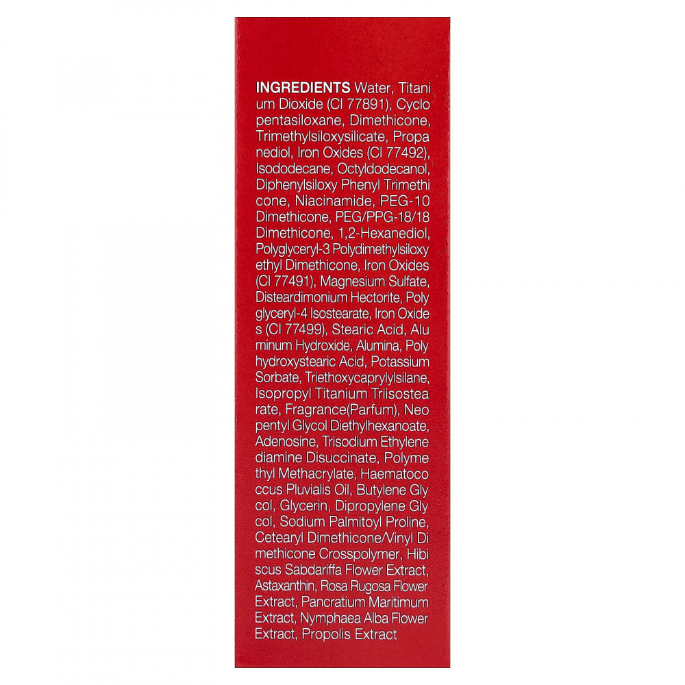 Вода, диоксид титана (CI 77891), циклопентасилоксан, диметикон, триметилсилоксисиликат, пропандиол, оксиды железа (CI 77492), изододекан, октилдодеканол, дифенил силокси фенилтриметикон, никотинамид, ПЭГ-10 диметикон, ПЭГ/ППГ-18/18 диметикон, 1,2-гександиол, полиглицерил-3 полидиметилсилоксиэтил диметикон, оксиды железа (CI 77491), сульфат магния, дистеардимония гекторит, полиглицерил-4 изостеарат, оксиды железа (CI 77499), стеариновая кислота, гидроксид алюминия, оксид алюминия, полигидроксистеариновая кислота, сорбат калия, триэтоксикаприлилсилан, изопропиловый триизостеарат титана, отдушка (парфюмерная композиция), неопентилгликоль диэтилгексаноат, аденозин, тринатрия этилендиамин дисукцинат, полиметилметакрилат, масло гематококка (Haematococcus pluvialis), бутиленгликоль, глицерин, дипропиленгликоль, пальмитоил пролин натрия, цетеарил диметикон/винил диметикон кроссполимер, экстракт цветков розеллы (Hibiscus sabdariffa), астаксантин, экстракт цветков розы морщинистой, экстракт панкрация морского (Pancratium maritimum), экстракт цветков кувшинки белой (Nymphaea alba), экстракт прополиса.