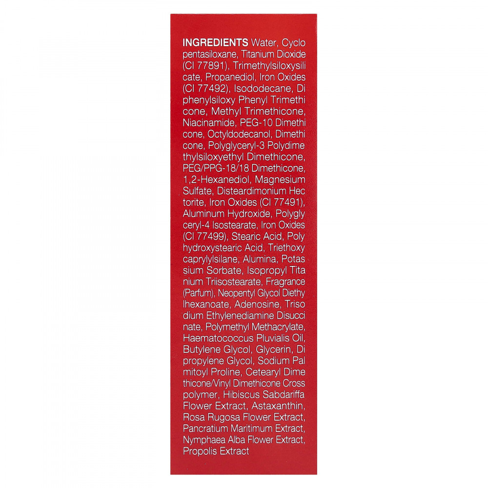 Вода, циклопентасилоксан, диоксид титана (CI 77891), триметилсилоксисиликат, пропандиол, оксиды железа (CI 77492), изододекан, дифенил силокси фенилтриметикон, метилтриметикон, никотинамид, ПЭГ-10 диметикон, октилдодеканол, диметикон, полиглицерил-3-полидиметилсилоксиэтилдиметикон, ПЭГ/ППГ-18/18 диметикон, 1,2-гександиол, сульфат магния, дистеардимония гекторит, оксиды железа (CI 77491), гидроксид алюминия, полиглицерил-4 изостеарат, оксиды железа (CI 77499), стеариновая кислота, полигидроксистеариновая кислота, триэтоксикаприлилсилан, оксид алюминия, сорбат калия, изопропиловый триизостеарат титана, парфюмерная композиция), неопентилгликоль диэтилгексаноат, аденозин, тринатрия этилендиамин дисукцинат, полиметилметакрилат, гематококк (гематококк плювиальный), бутиленгликоль, глицерин, ди пропиленгликоль, пальмитоил пролин натрия, кросс-полимер цетеарилдиметикон / винилдиметикон, экстракт цветков розеллы (Hibiscus sabdariffa), астаксантин, экстракт цветков розы морщинистой, экстракт панкрация морского (Pancratium maritimum), экстракт цветков кувшинки белой (Nymphaea alba), экстракт прополиса.