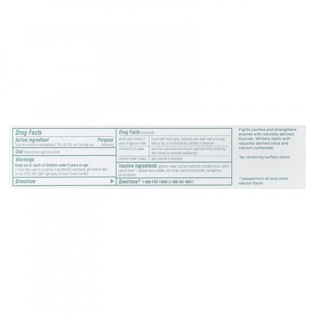 Fights cavities and strengthens enamel with naturally derived fluoride. Whitens teeth with naturally derived silica and calcium carbonate.
