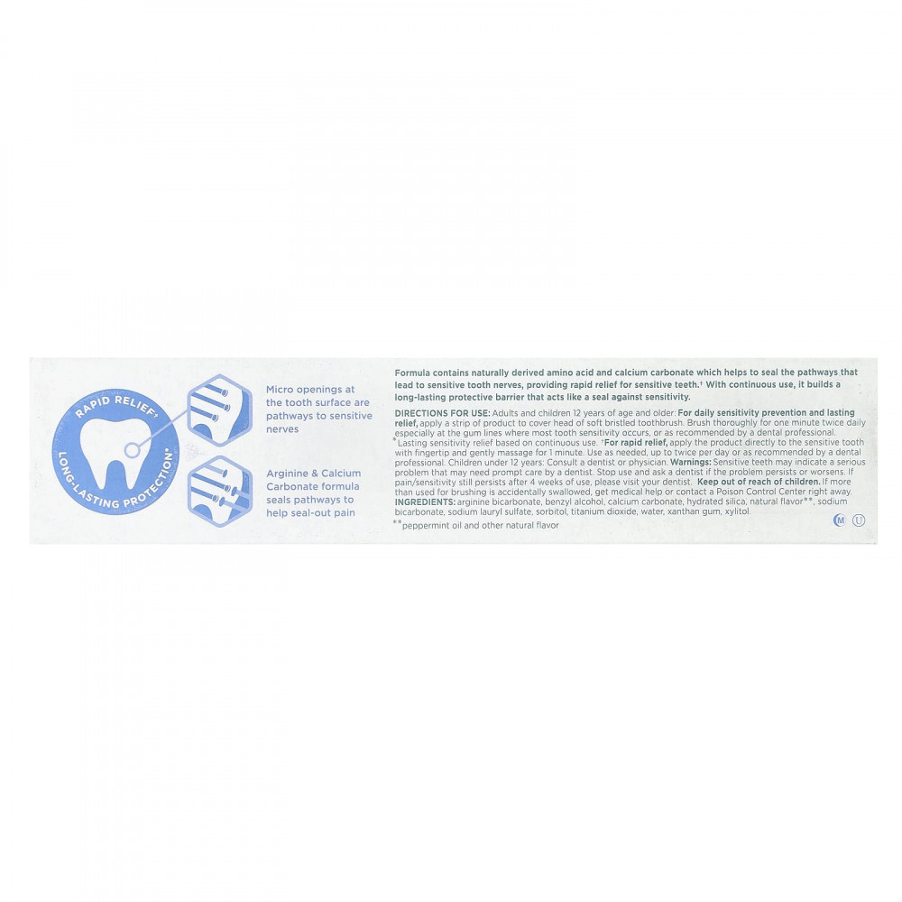 Формула содержит аминокислоты природного происхождения и карбонат кальция, который помогает закрыть проводящие пути, ведущие к чувствительным зубным нервам, обеспечивая быстрое восстановление чувствительных зубов. † При постоянном использовании он создает прочный защитный барьер, который действует как барьер против чувствительности.