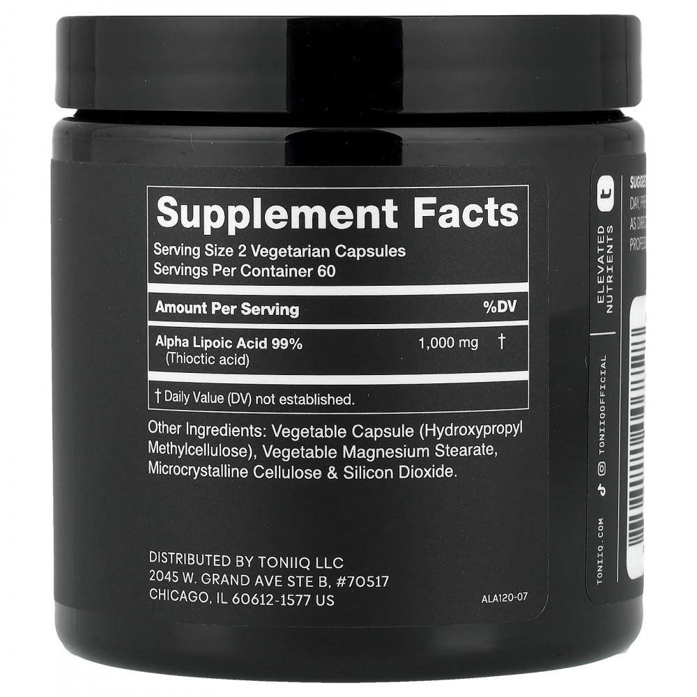 Toniiq, 1000 мг альфа-липоевой кислоты в одной порции, имеет беспрецедентный уровень чистоты — 99%+ (другие продукты с альфа-липоевой кислотой не раскрывают свой уровень чистоты).