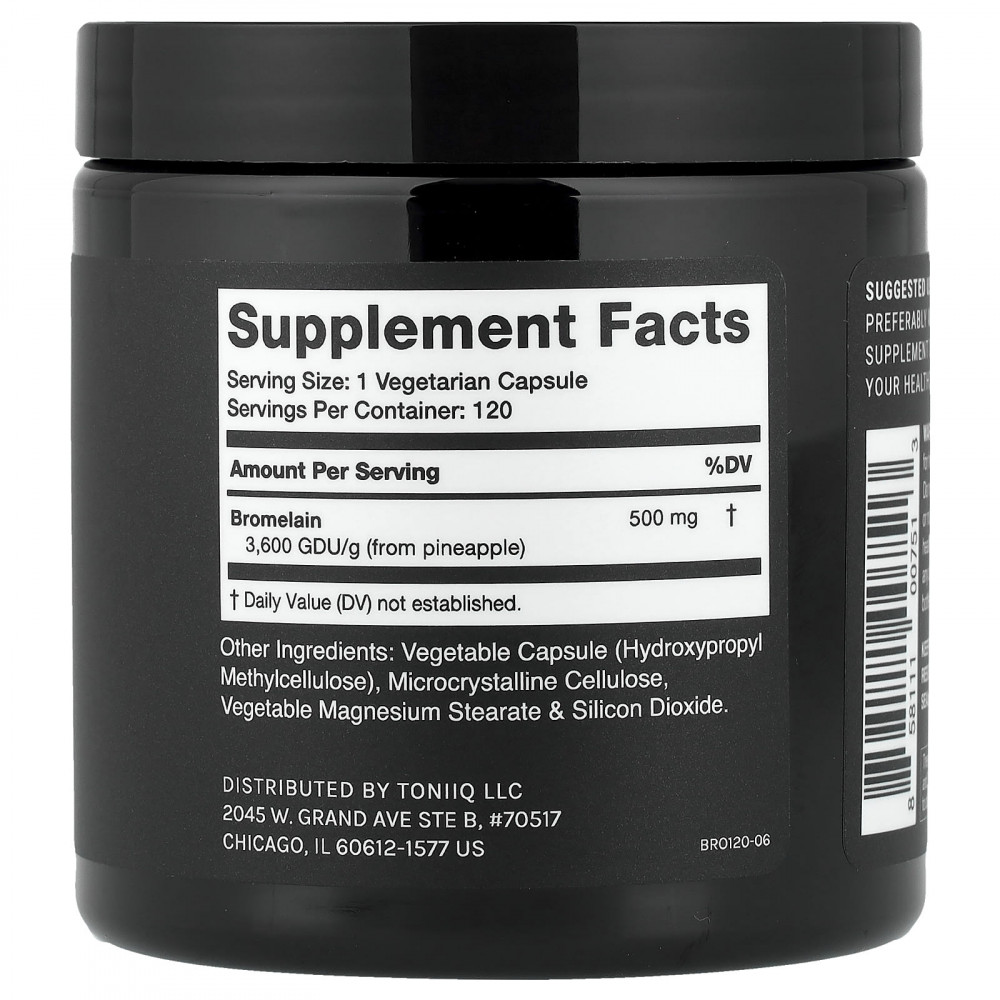 Капсулы Toniiq бромелаина содержат порошок бромелаина высочайшего качества в каждой таблетке, полученной из этических источников и выращенной с использованием процесса экстракции, обеспечивающего содержание более 3600 GDU/грамм (другие продукты с бромелаином содержат 1800 GDU/грамм или меньше). GDU/грамм — это единица измерения силы или уровня активности бромелаина.
