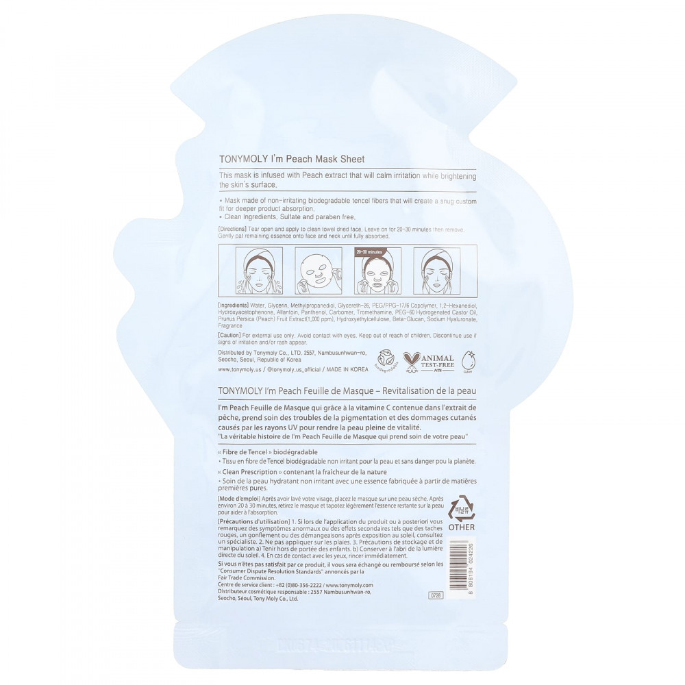 Разорвите и нанесите на чистую высушенную полотенцем кожу лица. Оставьте на 20–30 минут, затем снимите. Легкими похлопывающими движениями нанесите оставшуюся эссенцию на лицо и шею до полного впитывания.
