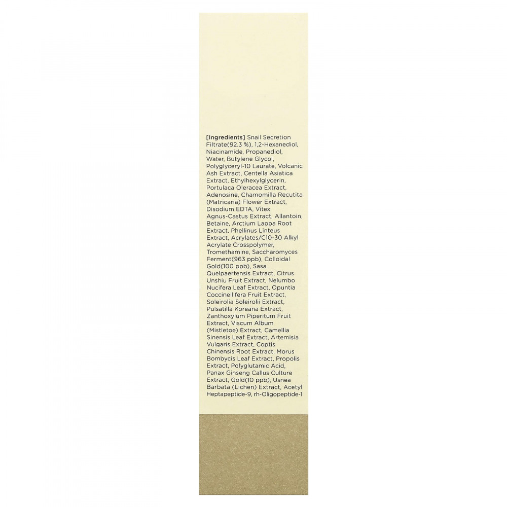 Фильтрат секрета улитки (92,3%), 1,2-гександиол, никотинамид, пропандиол, вода, бутиленгликоль, полиглицерил-10 лаурат, экстракт вулканического пепла, экстракт готу колы (Centella asiatica), этилгексилглицерин, экстракт портулака огородного (Portulaca oleracea), аденозин, экстракт цветков ромашки лекарственной (Chamomilla recutita), двунатриевая ЭДТК, экстракт витекса (Vitex agnus-castus), аллантоин, бетаин, экстракт корня лопуха (Arctium lappa), экстракт санхвана (Phellinus linteus), акрилат/c10-30 алкил акрилат кроссполимер, трометамин, Фермент сахаромицетов (963 част./млрд), коллоидное золото (100 част./млрд), экстракт бамбука (sasa quelpaertensis), экстракт плодов уншиу (Citrus unshiu), экстракт листьев лотоса орехоносного (Nelumbo nucifera), экстракт плодов опунции кошениленосной (Opuntia coccinellifera), экстракт солейролы (Soleiria roseirolii), экстракт корейской сон-травы (Pulsatilla koreana), экстракт сычуаньского перца (Zanthoxylum piperitum), экстракт омелы белой (Viscum album), экстракт листьев зелёного чая (Camellia sinensis), экстракт полыни (Artemisia vulgaris), экстракт корня сверции китайской (Swertia chinensis), экстракт листьев шелковицы (Morus bombycis), экстракт прополиса, полиглутаминовая кислота, экстракт каллусной культуры женьшеня обыкновенного (Panax ginseng), золото (10 част./млрд), экстракт лишайника (Usnea barbata), ацетил гептапептид-9, rh-олигопептид-1.