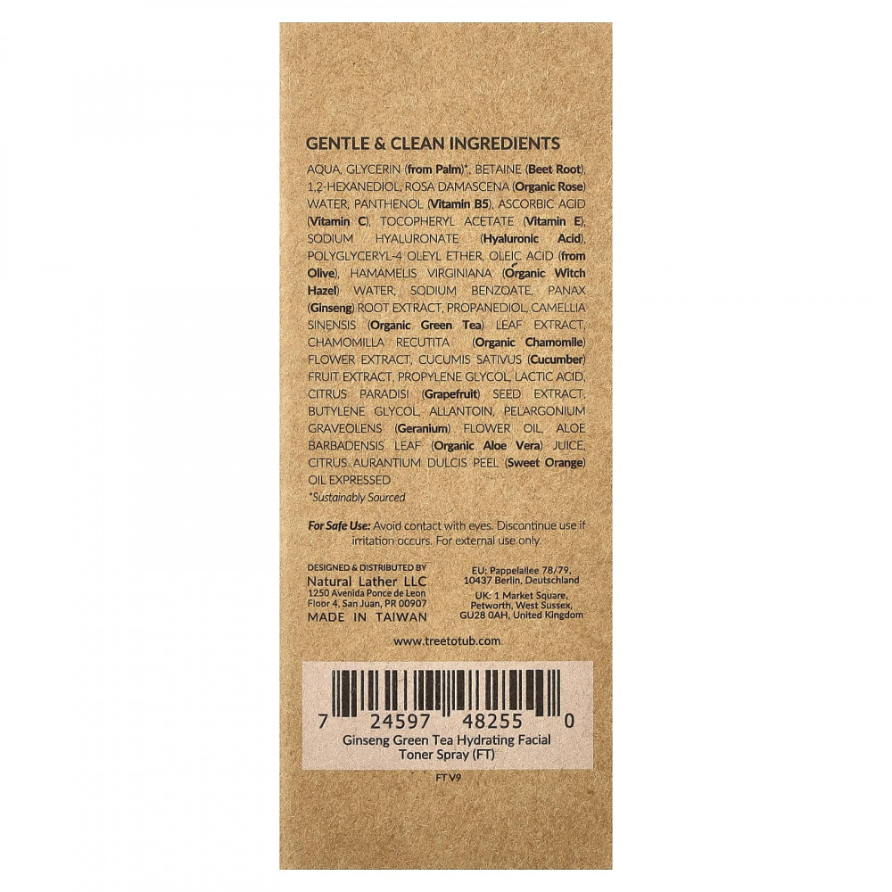 Вода, глицерин (из пальмы)*, бетаин (корнеплод свеклы) 1,2-гександиол, органическая розовая вода (дамасская роза [Rosa damascena]), пантенол (витамин B5), аскорбиновая кислота (витамин C), токоферилацетат (витамин E), гиалуронат натрия (гиалуроновая кислота) полиглицерил-4 олеиловый эфир, олеиновая кислота (из оливкового дерева), вода из органического гамамелиса (Hamamelis virginiana), бензоат натрия, экстракт корня женьшеня (Panax ginseng), пропандиол, экстракт листьев органического зеленого чая (Camellia sinensis), экстракт цветков ромашки (Chamomilla recutita), экстракт плодов огурца (Cucumis sativus), пропиленгликоль, молочная кислота, экстракт косточек грейпфрута (Citrus paradisi), бутилен гликоль аллантоин, масло из цветков герани (Pelargonium graveolens) сок из листьев органического алоэ вера (Aloe barbadensis), отжатое масло из цедры апельсина сладкого (Citrus aurantium dulcis).