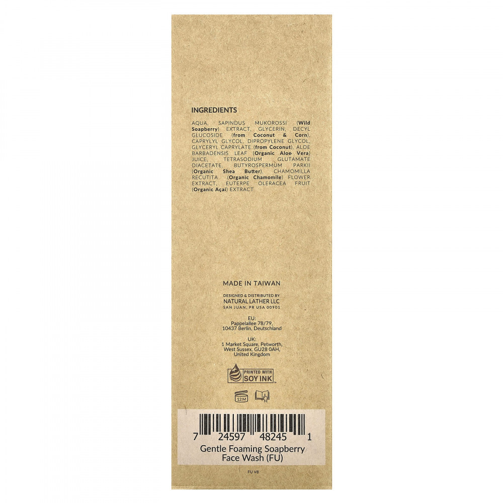 Вода, глицерин, экстракт дикорастущей ягоды (Sapindus mukorossi), децил глюкозид (из кокоса и кукурузы). каприлил гликоль, дипропиленгликоль, глицерил каприлат (из кокоса), сок листьев органического алоэ вера (Aloe barbadensis), диацетат глутамата тетранатрия, Butyrospermum parkii (органическое масло ши). экстракт цветков ромашки (Chamomilla recutita), экстракт плодов органической асаи (Euterpe oleracea).