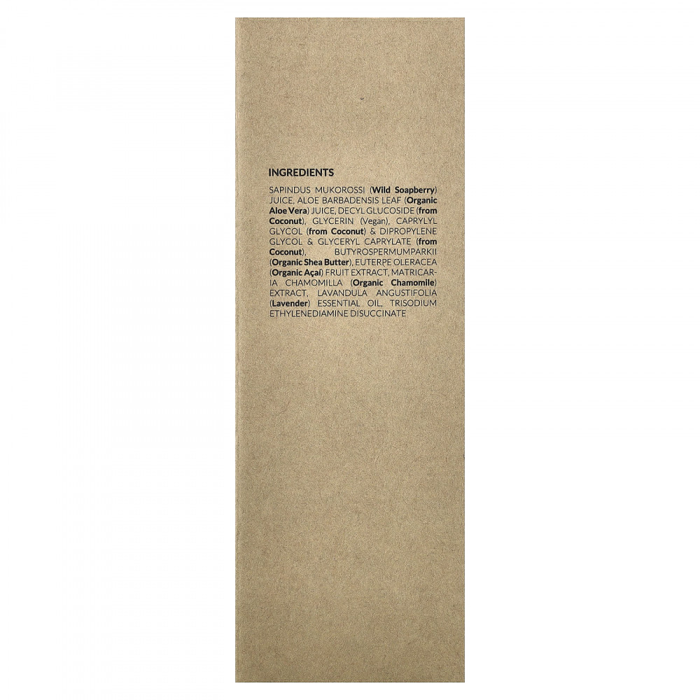 Сок дикорастущего мыльного дерева (Sapindus mukorossi), сок листьев органического алоэ вера (Aloe barbadensis), децил глюкозид (из кокоса), глицерин (веганский), каприлилгликоль (из кокоса), дипропиленгликоль и глицерил каприлат (из кокоса), органическое масло ши (Butyrospermumparkii), органический экстракт ягод асаи (Euterpe oleracea), экстракт органической ромашки (Matricaria chamomilla), эфирное масло лаванды (Lavandula angustifolia), тринатрий этилендиамин дисукцинат.