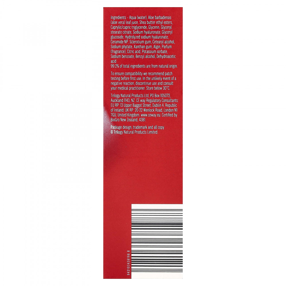 Вода, сок листьев алоэ вера (Aloe barbadensis), этиловые эфиры масла ши, каприловый/каприновый триглицерид, глицерин, глицерил стеарат цитрат, гиалуронат натрия, глицерил глюкозид, гидролизованный гиалуронат натрия, керамид NP, смола склероций, цетеариловый спирт, фитат натрия, ксантановая камедь, альгин, парфюмерная композиция (отдушка), лимонная кислота, сорбат калия, бензоат натрия, бензиловый спирт, дегидроуксусная кислота.