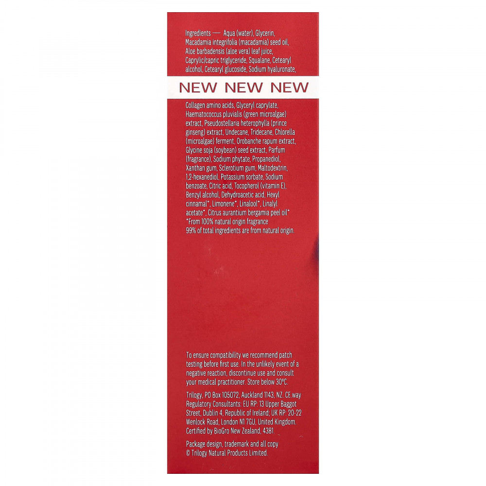 Вода, глицерин, масло из семян макадамии (Macadamia immunifolia), сок листьев алоэ вера (Aloe barbadensis), каприловый/каприновый триглицерид, сквалан, цетеариловый спирт, цетеариловый глюкозид, гиалуронат натрия, коллагеновые аминокислоты, глицерил каприлат, экстракт зеленых микроводорослей (Haematococcus pluvialis), экстракт женьшеня (Pseudostellaria hybrida), ундекан, тридекан, фермент хлореллы (микроводоросли), экстракт зародыша (Orobanche rapum), экстракт соевых бобов (Glycine soja), парфюмерная композиция (отдушка), фитат натрия, пропандиол, ксантановая камедь, смола склероций, мальтодекстрин, 1,2-гександиол, сорбат калия, бензоат натрия, лимонная кислота, токоферол (витамин E), бензиловый спирт, дегидроуксусная кислота, гексил циннамал*, лимонен*, линалоол*, линалил ацетат*, масло из цедры апельсина (Citrus aurantium bergamia)*.