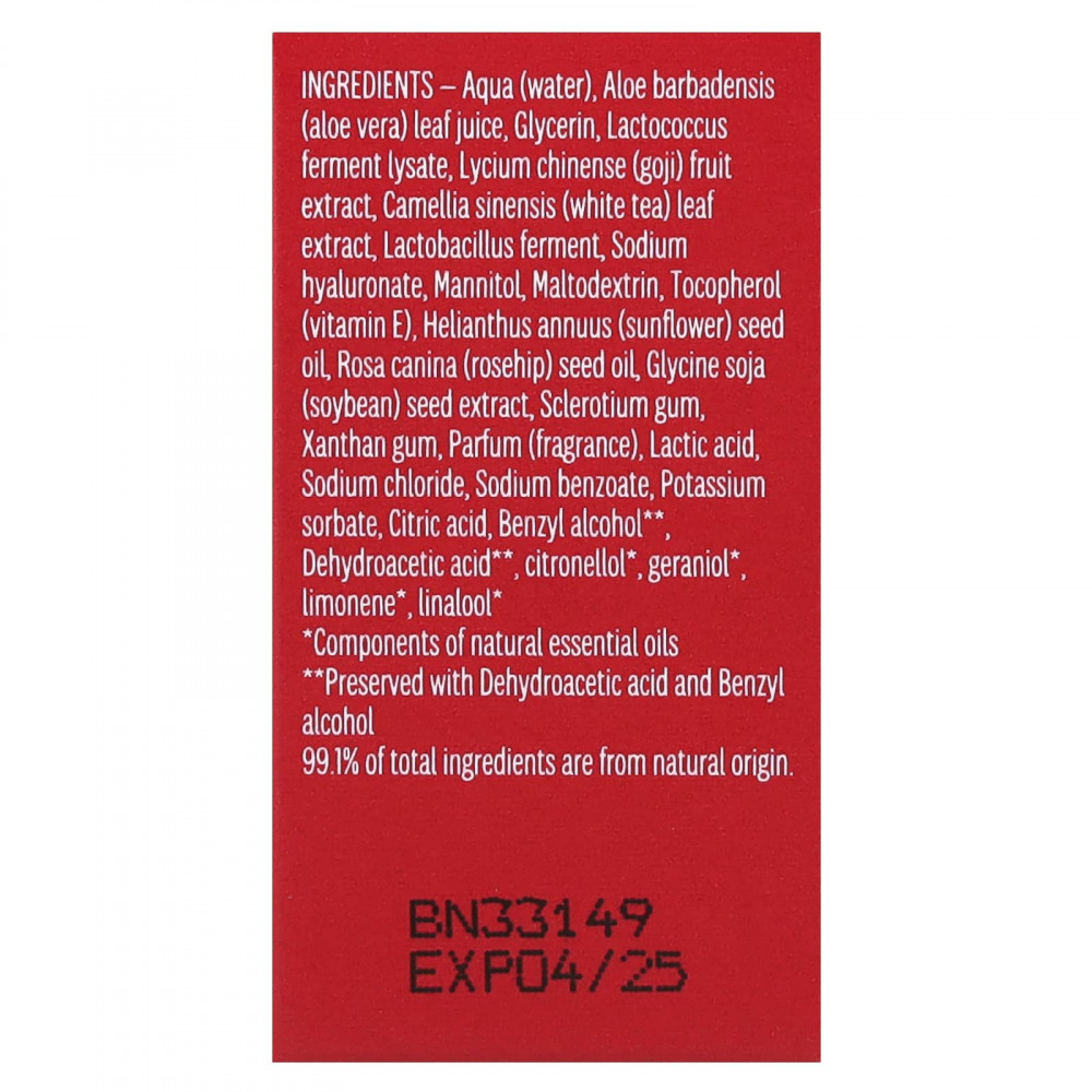Вода, сок листьев алоэ вера (Aloe barbadensis), глицерин, лизат ферментов лактококка, экстракт плодов годжи (Lycium chinense), экстракт листьев белого чая (Camellia sinensis), фермент лактобактерий (Lactobacillus), гиалуронат натрия, маннит, мальтодекстрин, токоферол (витамин Е), подсолнечное масло (Helianthus annuus), масло из семян шиповника (Rosa canina), экстракт соевых бобов (Glycine soja), смола склероций, ксантановая камедь, парфюмерная композиция (отдушка), молочная кислота, хлорид натрия, бензоат натрия, сорбат калия, лимонная кислота, бензиловый спирт **, дегидроуксусная кислота **, цитронеллол *, гераниол * лимонен *, линалоол*.