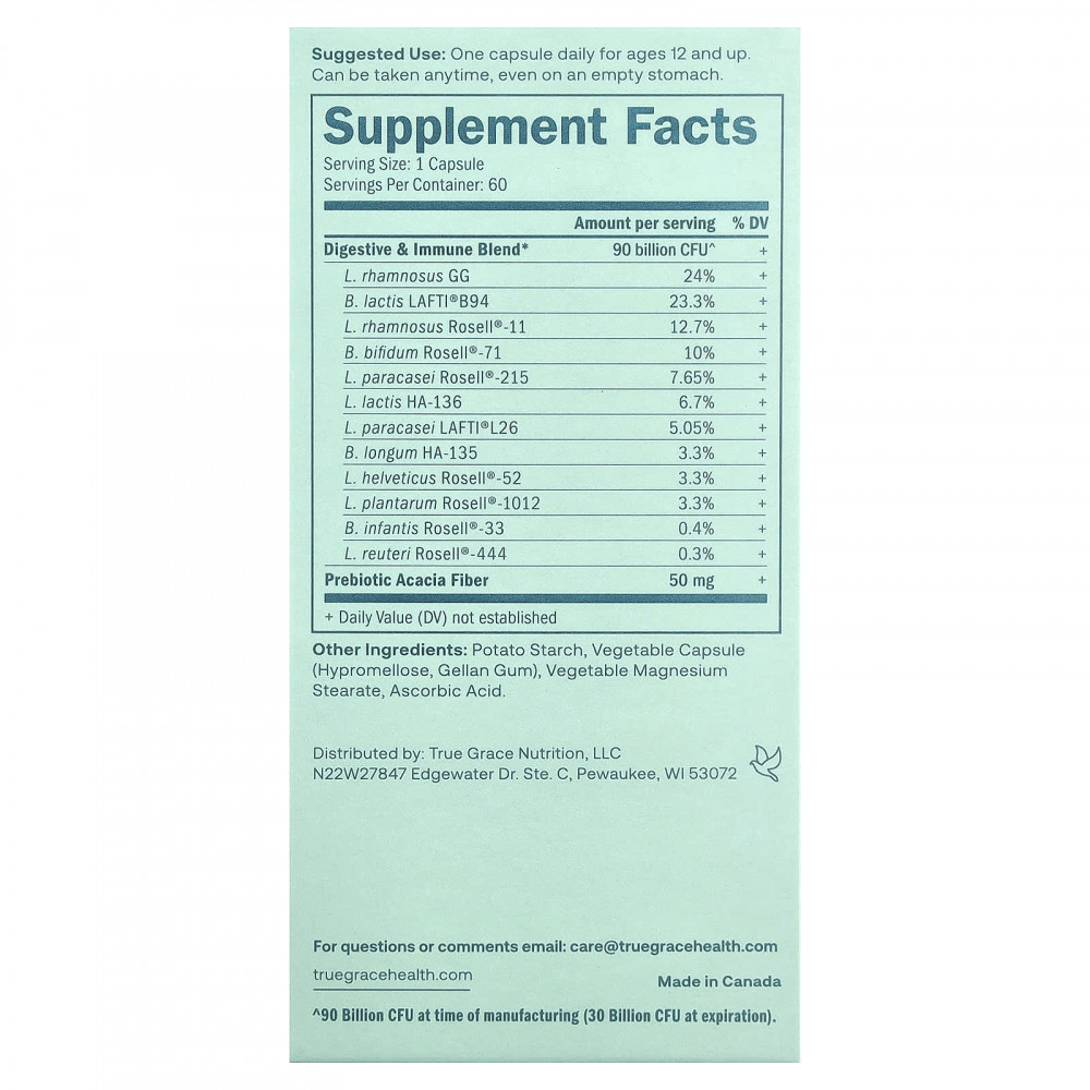 Пробиотики True Grace доставляются в запатентованных вегетарианских капсулах DRcaps®, которые обеспечивают защиту от желудочного сока, позволяя пробиотикам выживать в процессе пищеварения и достигать кишечника.