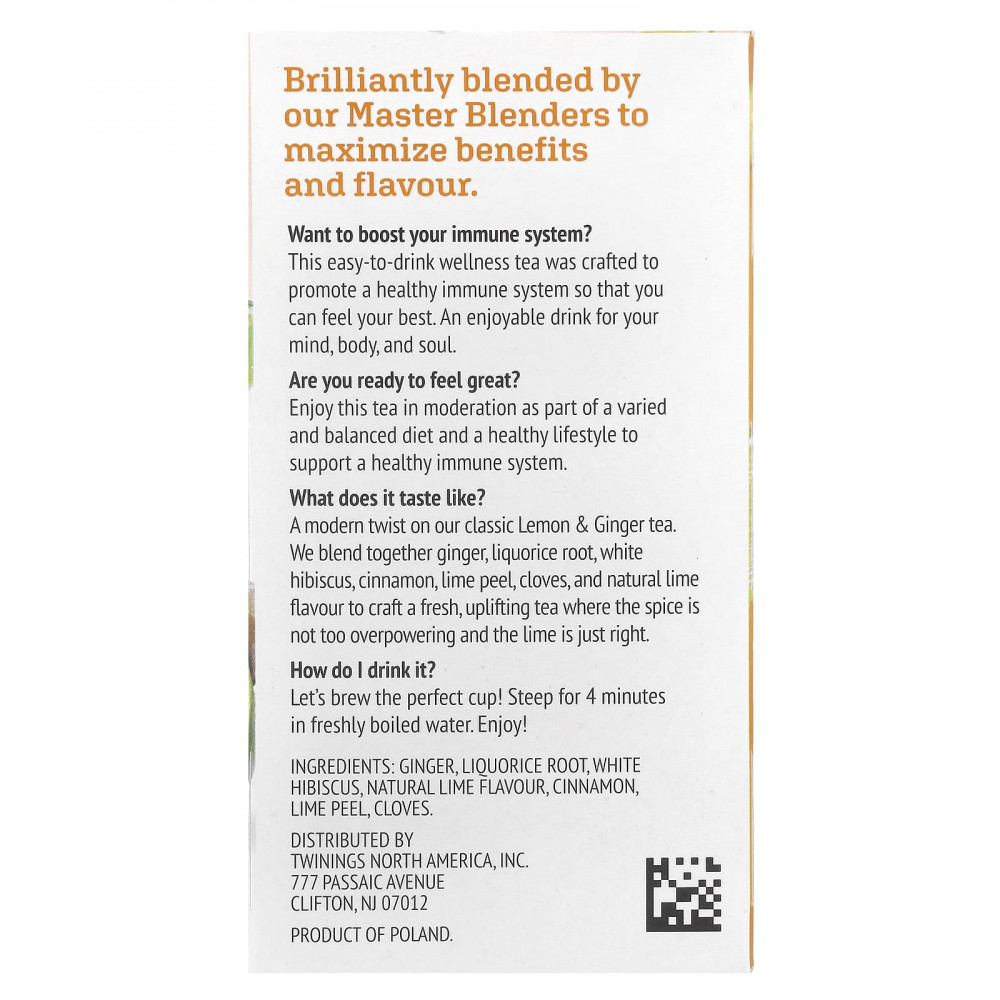 В современной интерпретации классического напитка Lemon & Имбирный чай: мы смешиваем имбирь, корень солодки, белый гибискус, корицу, цедру лайма, гвоздику и натуральный ароматизатор лайма, чтобы создать свежий, бодрящий чай, в котором пряности не слишком сильны, а лайм идеально подходит.