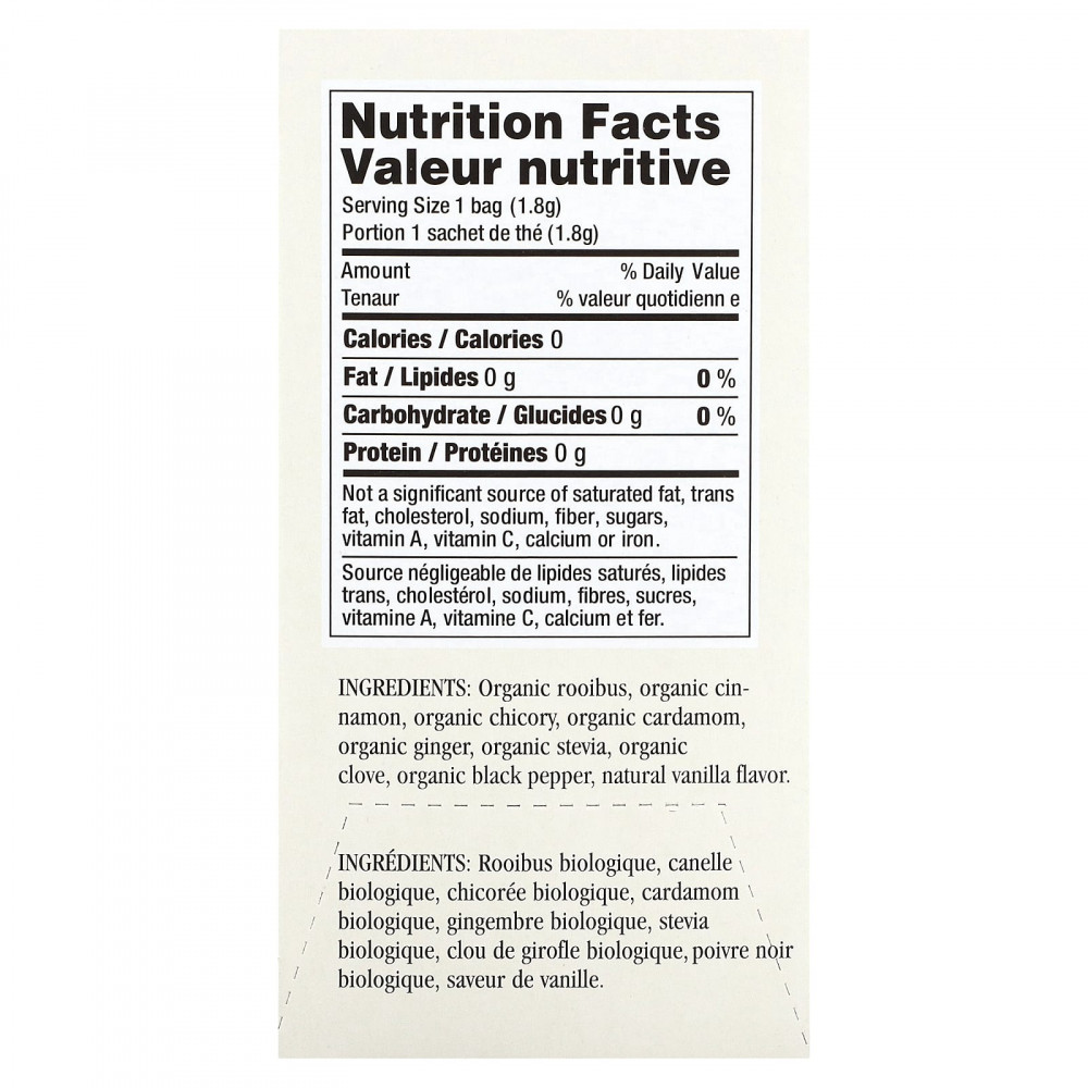 Органический ройбуш, органическая корица, органический цикорий, органический кардамон, органический имбирь, органическая стевия, органическая гвоздика, органический черный перец, натуральный ароматизатор «Ваниль».