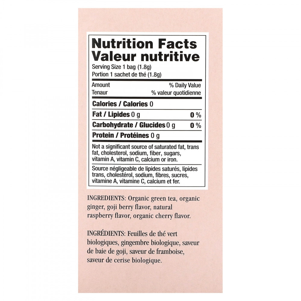 Organic green tea, organic ginger, goji berry granules, organic raspberry flavor, organic, cherry flavor.