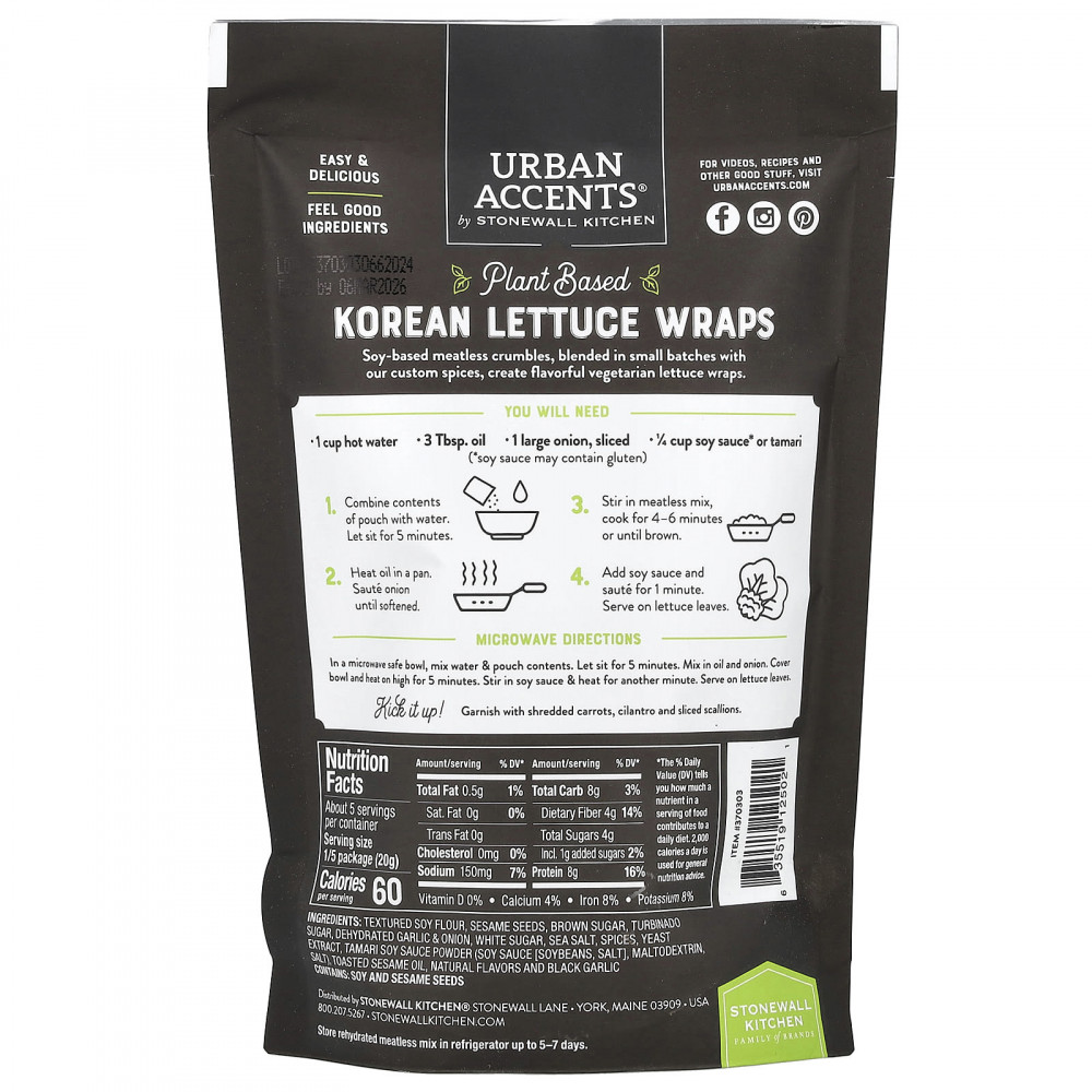Наш микс, вдохновленный сладким и соленым вкусом умами корейского барбекю, заправлен чесноком, луком, ореховыми семенами кунжута, соевым соусом и небольшим количеством коричневого сахара, чтобы сбалансировать его. Приготовьте ароматные рулеты из корейского салата-латука или бросьте его в маисовую лепешку и съешьте в стиле тако. В любом случае, смесь без мяса для корейского барбекю от Urban Accents обязательно понравится! Наши смеси без мяса на растительной основе созданы из измельченного растительного белка. Каждый пакетик заменяет 1 фунт мясного фарша и отличается высоким содержанием клетчатки и белка (40 г) при низком содержании жира и калорий.