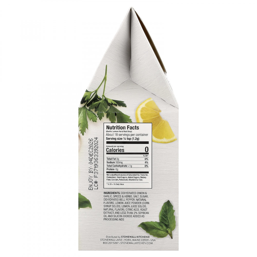 Чеснок, лимон и травы Обезвоженный лук и чеснок, специи и травы, соль, сахар, обезвоженный болгарский перец, натуральные ароматизаторы, порошок из лимонного сока (сухие вещества кукурузного сиропа, сухие вещества лимонного сока, натуральный ароматизатор), лимонная кислота, экстракт дрожжей, и менее 2% соевого масла и диоксида кремния, добавленных в качестве технологических добавок.